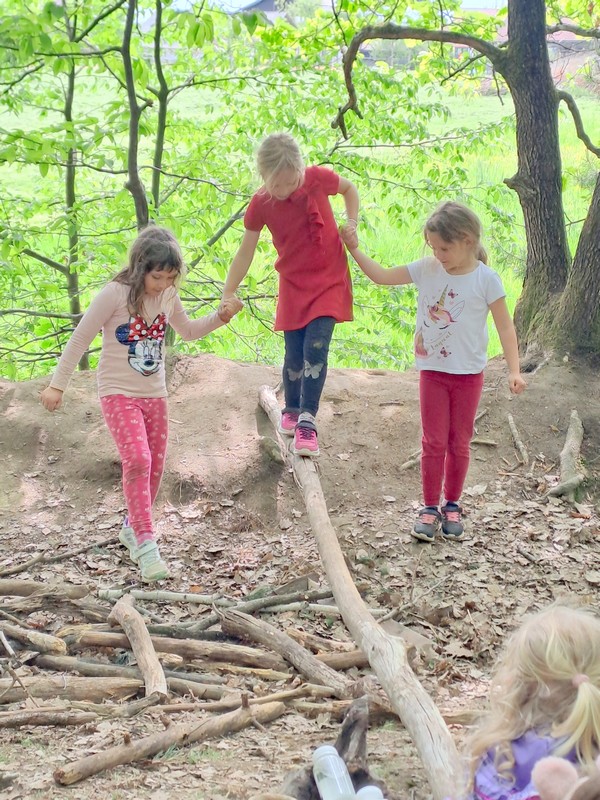 Ker pa vemo, da je za zdravje poleg prehrane pomembno tudi gibanje, vsak dan poskrbimo za raznolike gibalne dejavnosti. Jutra začnemo z razgibavanjem ob glasbi, igramo se različne gibalne in glasbeno-didaktične igre, v skupnem prostoru izvajamo vodene vadbene urice. Radi hodimo na sprehode, se igramo na igrišču, še posebej pa uživamo, ko gremo v gozd. V njem plezamo po drevesih in klančinah, premagujemo naravne ovire, prenašamo veje in gradimo naravna bivališča. Preden vstopimo v gozd, pa pogosto tudi tečemo po travniku.