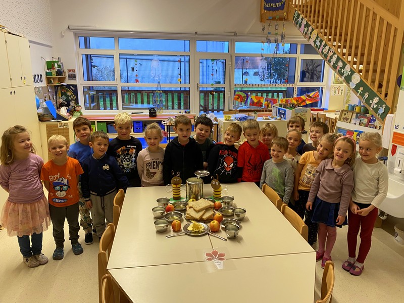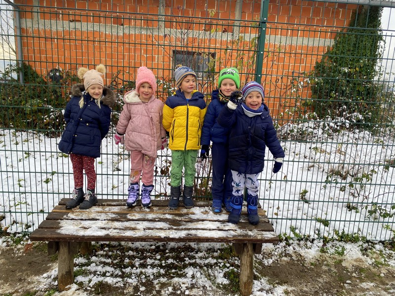 V gozdu smo se igrali z listjem, v igralnici pa ustvarjali jesenska drevesa. Ob sredah nas je obiskovala miška Neli, ki je poskrbela za glasbeno veselje. Telovadili smo, plesali po hodniku in se razveselili obiska škrata Prijateljčka. Obeležili smo tradicionalni slovenski zajtrk, se razveselili snega in prisluhnili knjižničarki Andreji, ki nam je prebrala zgodbo Veliki bučni podvig.