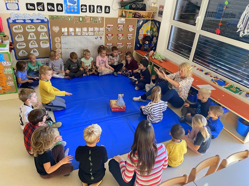 Igralčki z vzgojiteljico Natašo in Heidi.