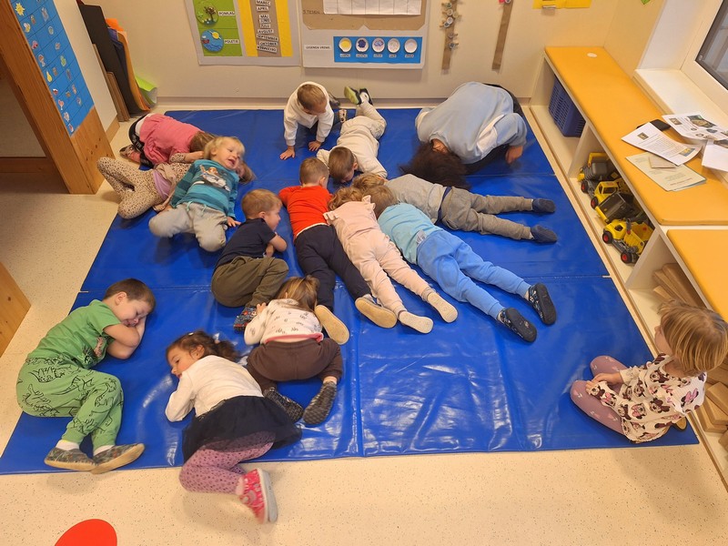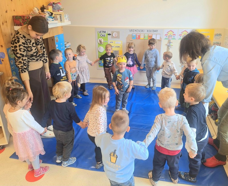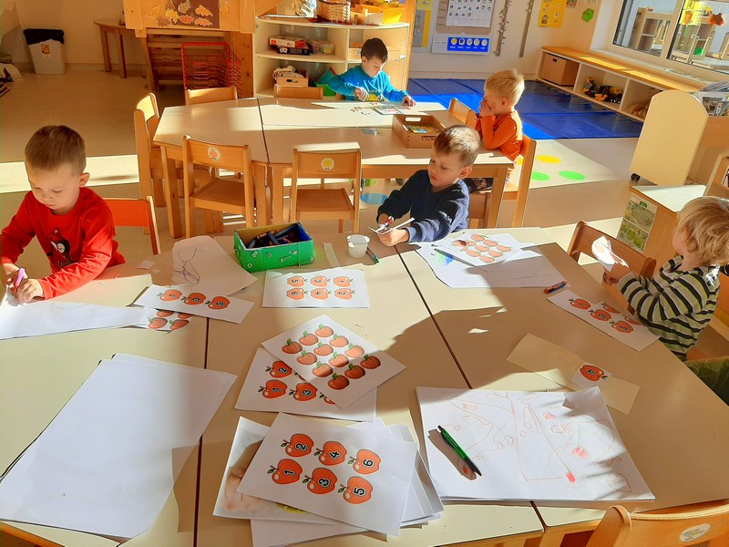 Spoznavali so zdravo hrano, praznovali rojstni dan, opazovali spremembe v gozdu, sadovnjaku in na vrtu ter preizkusili tiskanje z jabolkom in hruško, odtiskovali pa so tudi jesenske liste, ki so jih nabrali v gozdu in na vrtčevskem igrišču. Ogledali so si drevesa v sadovnjaku, na vrtčevskem igrišču in v gozdu in spoznavali jesen. Barve, odtenki, mešanje barv so jesen prinesli tudi v igralnico. Spoznavali so tudi pojem ozimnica. Kamišibaj zgodba Ježevka in hruška je otrokom v vrtcu prinesla dogajanje na robu gozda in jih popeljala v svet prijateljstva in medsebojne pomoči.