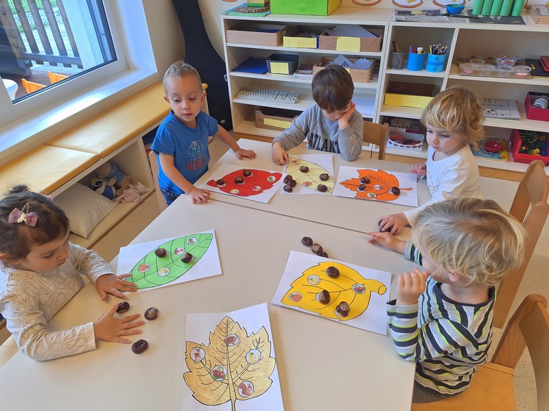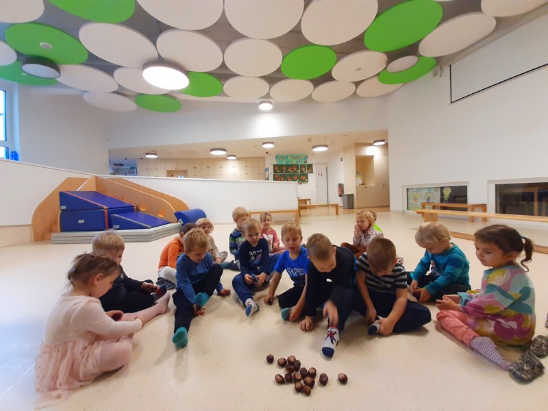 Spoznavali so zdravo hrano, praznovali rojstni dan, opazovali spremembe v gozdu, sadovnjaku in na vrtu ter preizkusili tiskanje z jabolkom in hruško, odtiskovali pa so tudi jesenske liste, ki so jih nabrali v gozdu in na vrtčevskem igrišču. Ogledali so si drevesa v sadovnjaku, na vrtčevskem igrišču in v gozdu in spoznavali jesen. Barve, odtenki, mešanje barv so jesen prinesli tudi v igralnico. Spoznavali so tudi pojem ozimnica. Kamišibaj zgodba Ježevka in hruška je otrokom v vrtcu prinesla dogajanje na robu gozda in jih popeljala v svet prijateljstva in medsebojne pomoči.