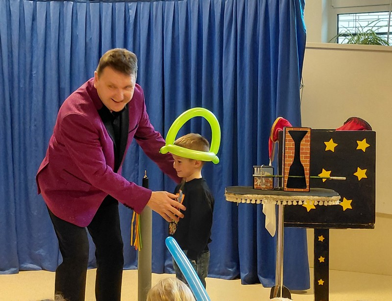 Poleg čaranja je Andrej ustvarjal tudi umetnije z baloni, iz njih je oblikoval različne živali, pokrivala in meče, ki so nam narisali nasmehe na obraz. Med nastopom je tudi zapel in otroke  povabil, da so peli skupaj z njim. S čarobnim prahom je čaral smeh, veselje in dobro voljo, ki je napolnila ves prostor.