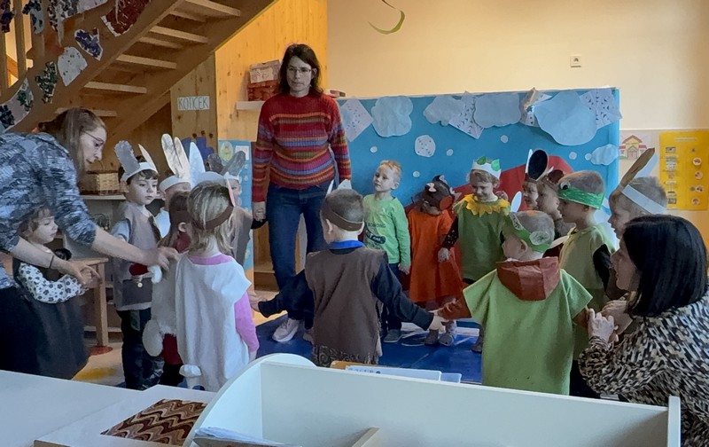 Iz gozda in piskrčka pa smo se preselili tudi v grad. No, pravzaprav NAVIHANČKI. Skozi igro, gib in glasbo so oživili glasbeno pravljico Grad gradiček, kjer so pokazali veliko ustvarjalnosti in poguma. Nekateri otroci so prevzeli vlogo živali, ki so želele živeti v gradu, drugi pa so s preprostimi ritmi dogajanje spremljali z igranjem na Orffove inštrumente ter tako poskrbeli za glasbeno obogatitev zgodbe.