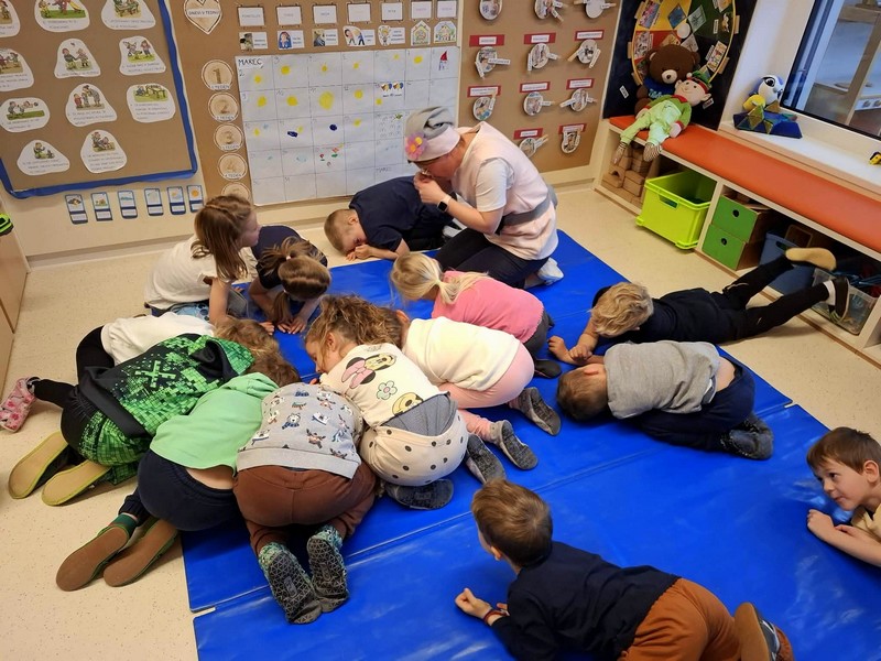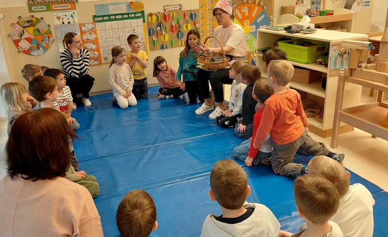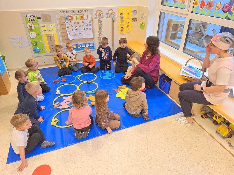 Prihod pomladi so v vrtcu obeležili na prav poseben način. Otroke je po skupinah obiskala pomladna palčica, ki jih je popeljala v domišljijski svet pomladi. S pomočjo gibalne zgodbe so skupaj raziskovali, kako se narava prebuja in kako pomlad počasi prihaja med nas.