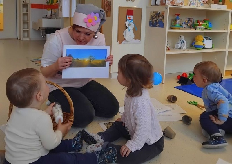 Pri iskanju so jim pomagale fotografije znanilcev pomladi. Tako so skozi igro, pogovor in gibanje počasi odkrivali, da je pomlad že vse okoli nas.
