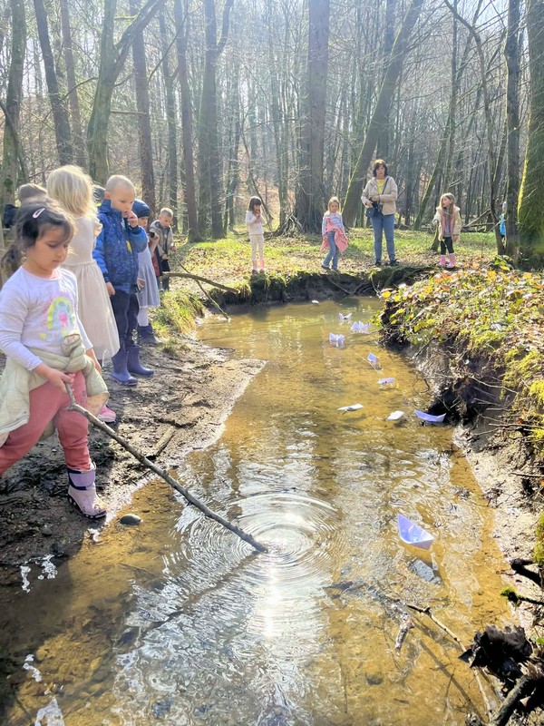 Po potoku smo v znak pomladi spustili papirnate ladjice in pozdravili toplejše dni.