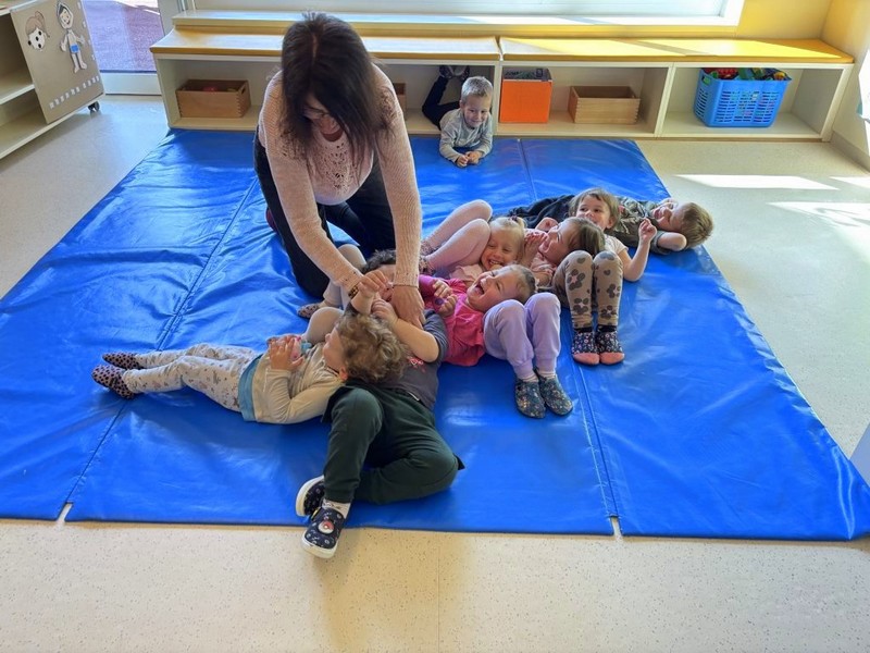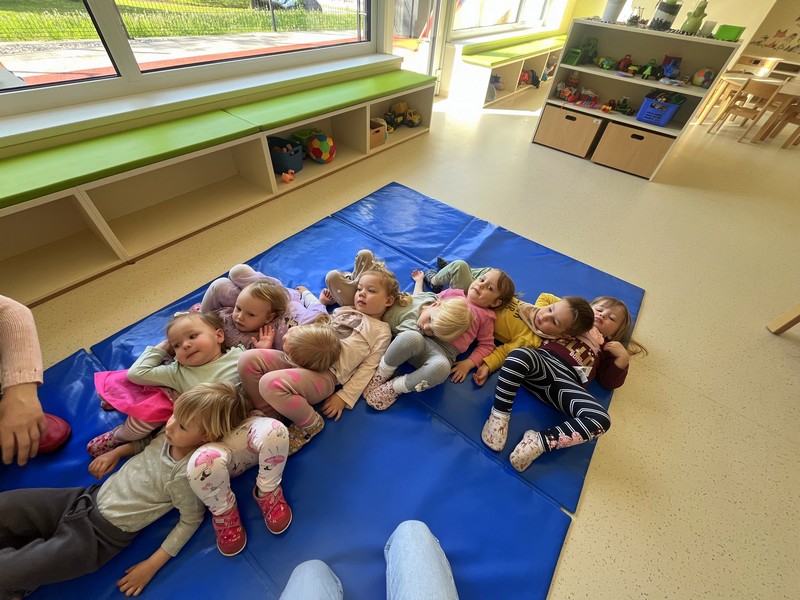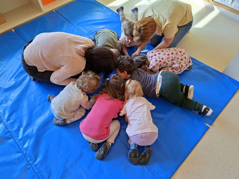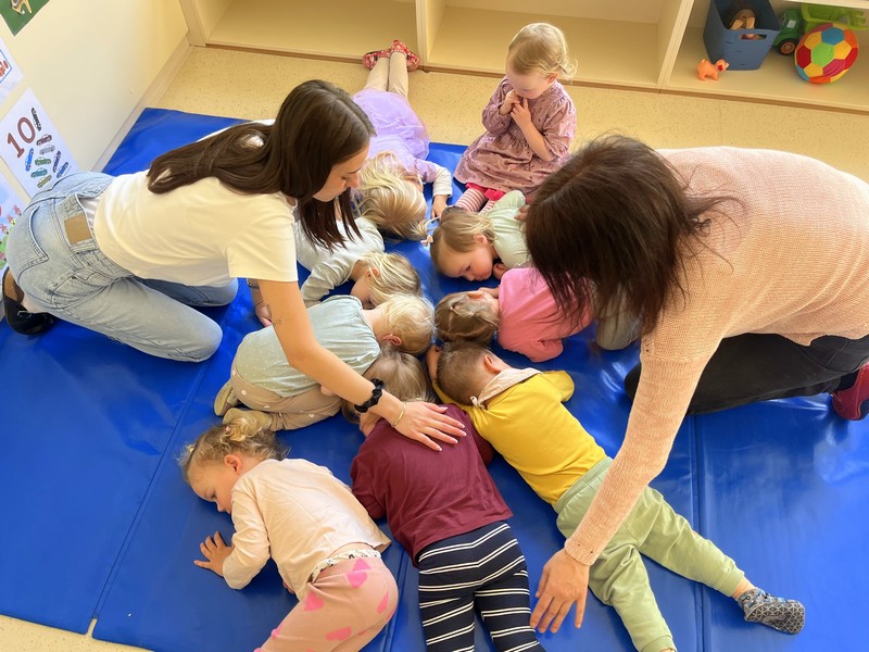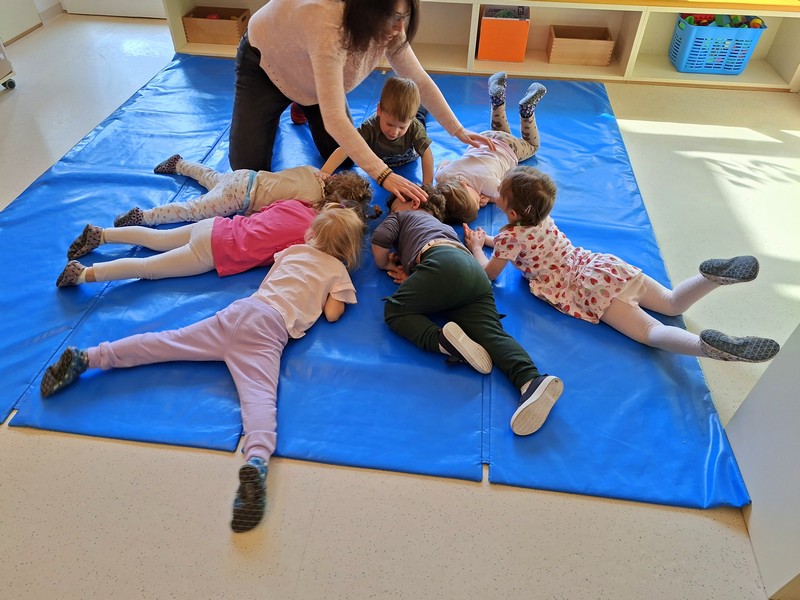 V petek, 17. 4. 2026, se je vzgojiteljica Tina sprehodila po posameznih igralnicah in otrokom pripravila krajše trenutke sproščanja. Skozi igro, v kateri so s svojimi telesi ustvarili »kačo«, so se prepustili zaupanju in občutku varnosti, ob tem pa sproščeno uživali v smehu, ki ga je spodbudilo nežno žgečkanje. V nadaljevanju so se povezali v krog, sklonili glave in skupaj ustvarili simbol sonca, ki jih povezuje in greje. Ko so se prijeli za roke, so »zanetili sončne žarke«, ob tem pa začutili toplino, ki se je širila med njihovimi dlanmi.