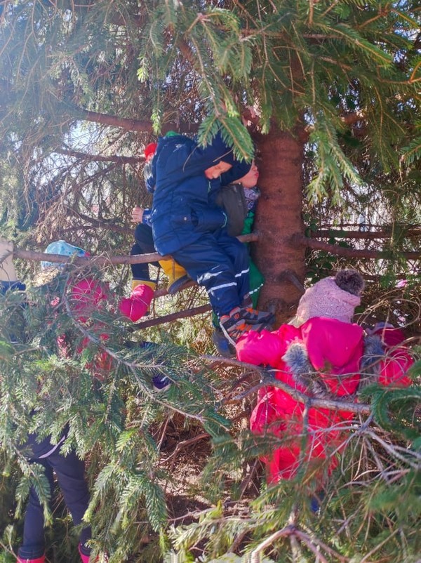 Gozd je naš raziskovalni center, kot radi rečemo, saj najdemo ogromno skritih gozdnih zakladov in idej. A veste da se je v Artičah zasidral Titanik? Ja, imamo gozdni Titanik in to kar tri. Kar poglejte kako na njem plujemo, s čuvajkama mornarkama. Ko pa nismo na ladji, pa lovimo ribe, delamo strupene napoje, se povezujemo z gozdom na energijski točki, delamo ledene sladolede, plezamo na drevesa in se tudi skrijemo v košati smreki.