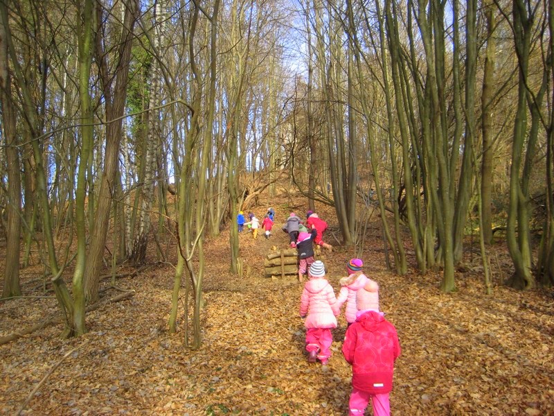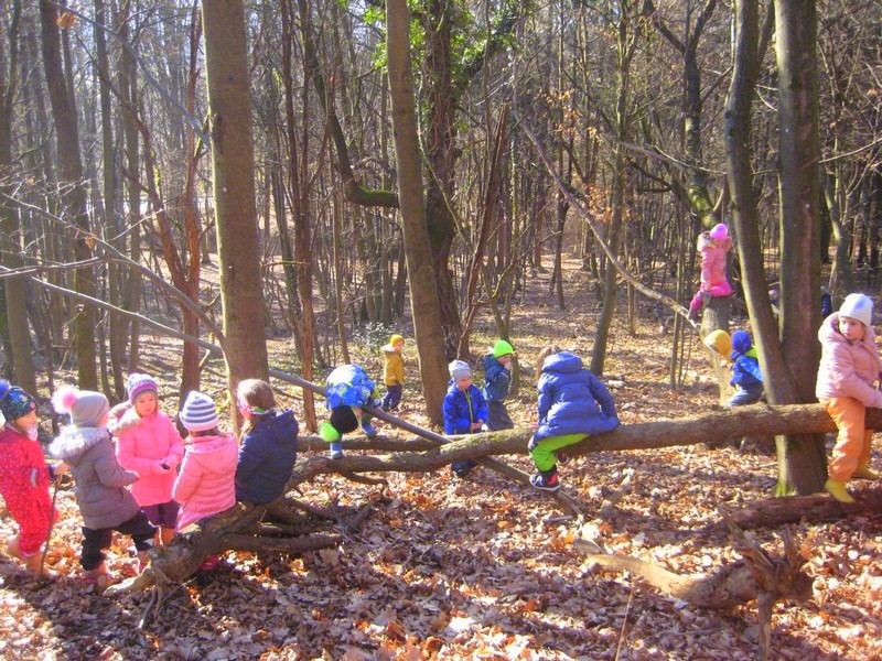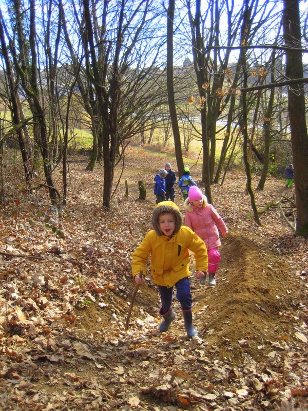 Našega dopoldneva pa si ne znamo predstavljati brez obiska gozda. Toliko kotičkov smo že odkrili in poimenovali! Sprejemnica, Grad, Raketa, Črka L, Smaragdni gozd, Škratkova jedilnica, Tobogan in pred kratkim odkrito super Dirkališče.