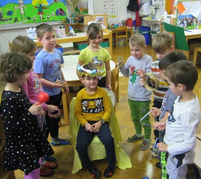 Naša Hruška Debeluška je prava zaspanka. Vsak ponedeljek nam v svoji glasbeni skrinjici pripravi zanimivo dejavnost, a kaj ko je takšna zaspanka, da jo moramo vedno prebujati. Kako? S pesmico seveda. Ker nekateri že znamo brati, sami preberemo kaj piše na njenem listu. Igramo se z ritmi na različne načine, razvijamo slušno pozornost in kraljeviču Marku igramo na željene instrumente.