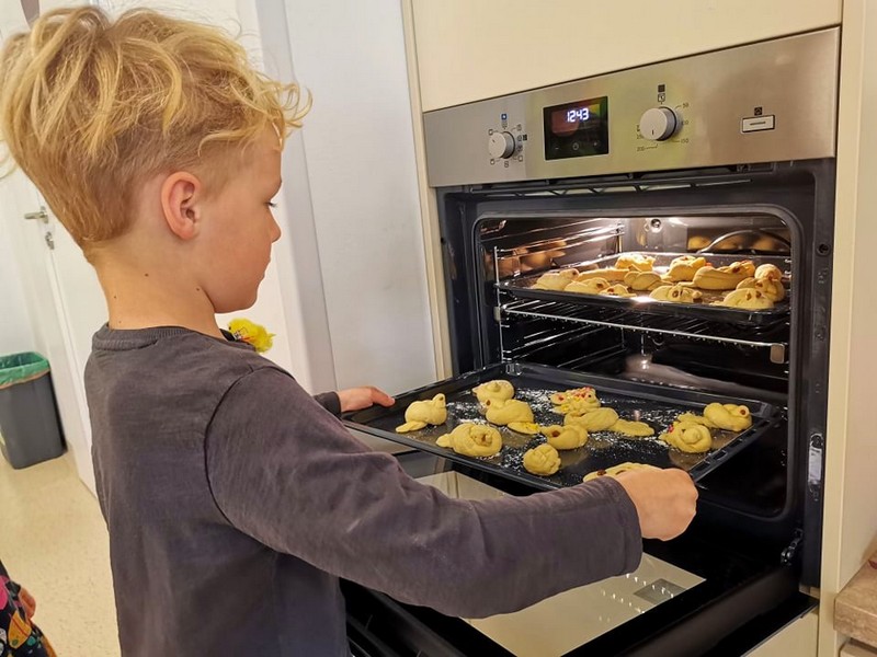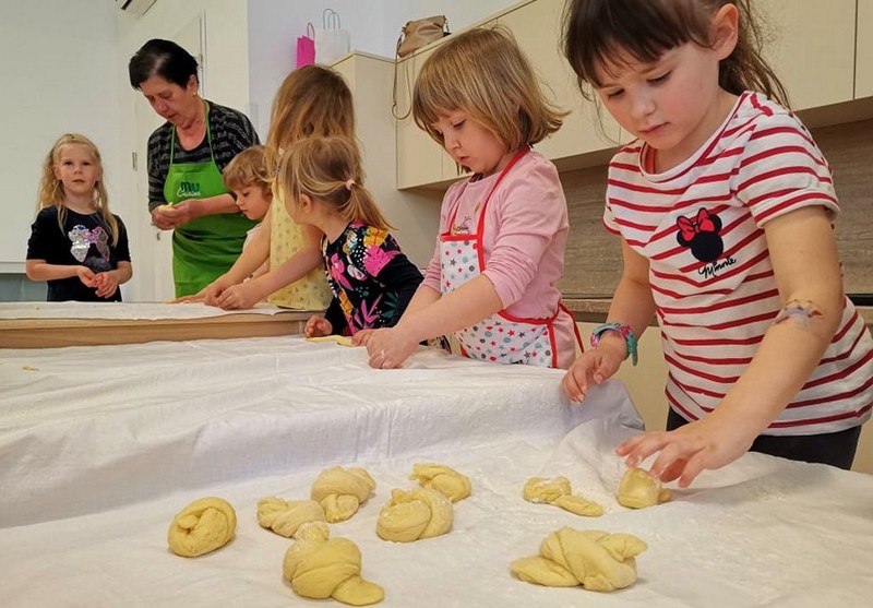 Ker pa imamo v našem novem vrtcu čisto svojo pravo kuhinjo, pa smo izkoristili prijetno s koristnim in se podali v pekarsko delavnico, kjer smo s pomočjo babice naredili ptičke iz testa.. mmmmm, kako prijetno je dišalo po celem vrtcu.