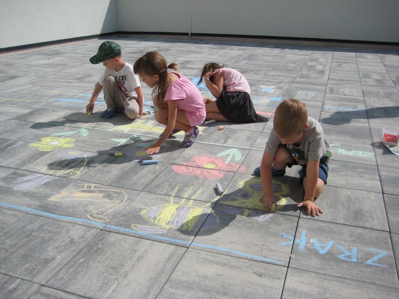 Skupina Igralčki so ustvarjali na asfaltnem igrišču za telovadnico, kjer so pobudo za risanje prevzele deklice. Veliko se pogovarjamo o živalih, ki živijo blizu nas, ki živijo v Sloveniji in tako ugotavljamo, da so nekatere zares ogrožene, pa naj bo to zaradi izumrtja ali posledice nas samih.