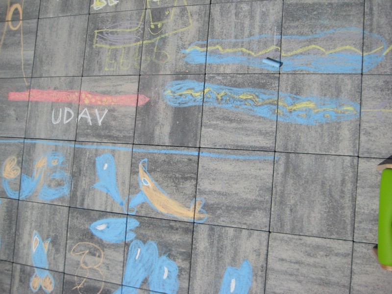 Tako smo Igralčki in Navihančki zavihali rokave (no, nismo ravno rabili, saj je bilo zelo toplo vreme, hihi), vzeli krede in se podali v svet risanja.