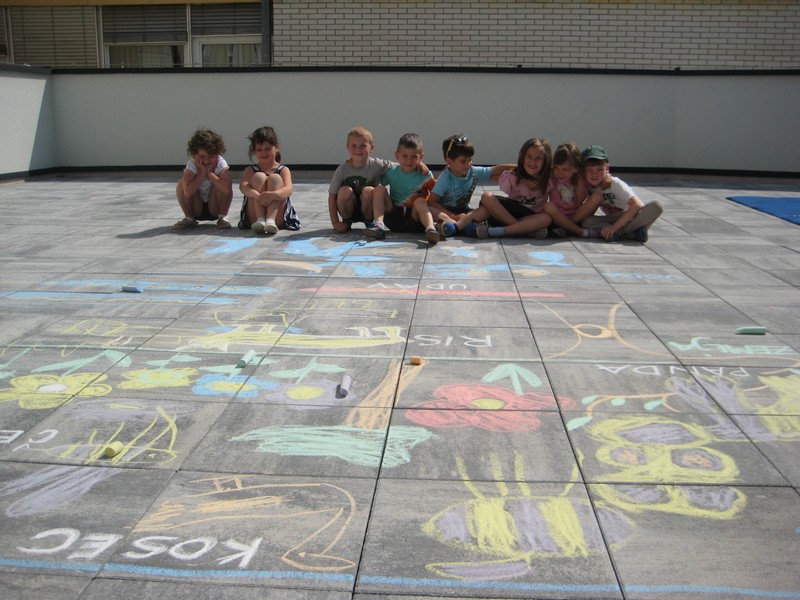 Skupina Igralčki so ustvarjali na asfaltnem igrišču za telovadnico, kjer so pobudo za risanje prevzele deklice. Veliko se pogovarjamo o živalih, ki živijo blizu nas, ki živijo v Sloveniji in tako ugotavljamo, da so nekatere zares ogrožene, pa naj bo to zaradi izumrtja ali posledice nas samih.