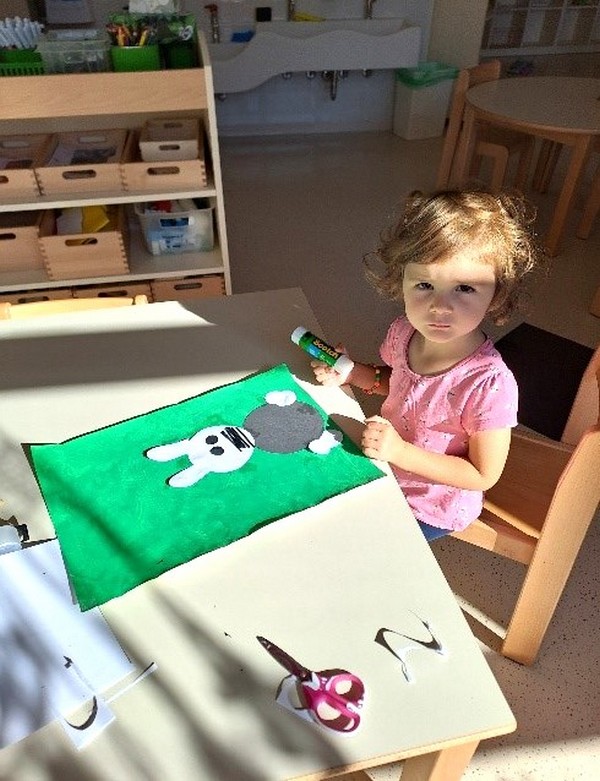 Nekega jutra nas je obiskal zajček- lutka. Animacija z lutko je otroke zelo pritegnila. Ob slikah so otroci spoznali, kje zajček živi, s čim se prehranjuje, kako se zajčki igrajo,…Nato smo prepevali pesmice ob spremljavi kitare in plesali. Ko so že zelo dobro spoznali živalco z dolgimi uhlji, je vsak otrok izdelal lepljenko-sliko zajčka. Te pa krasijo stene naše igralnice.