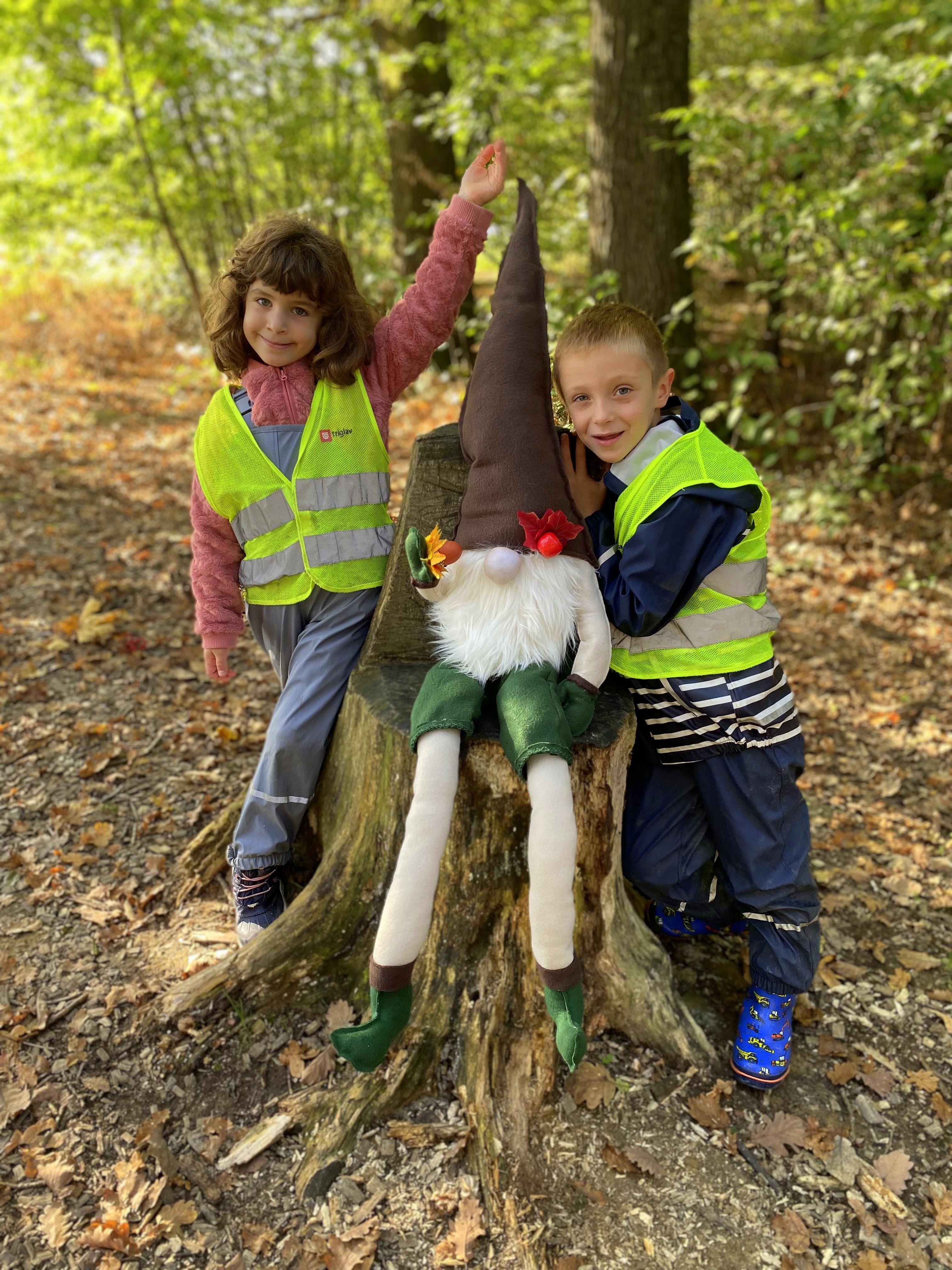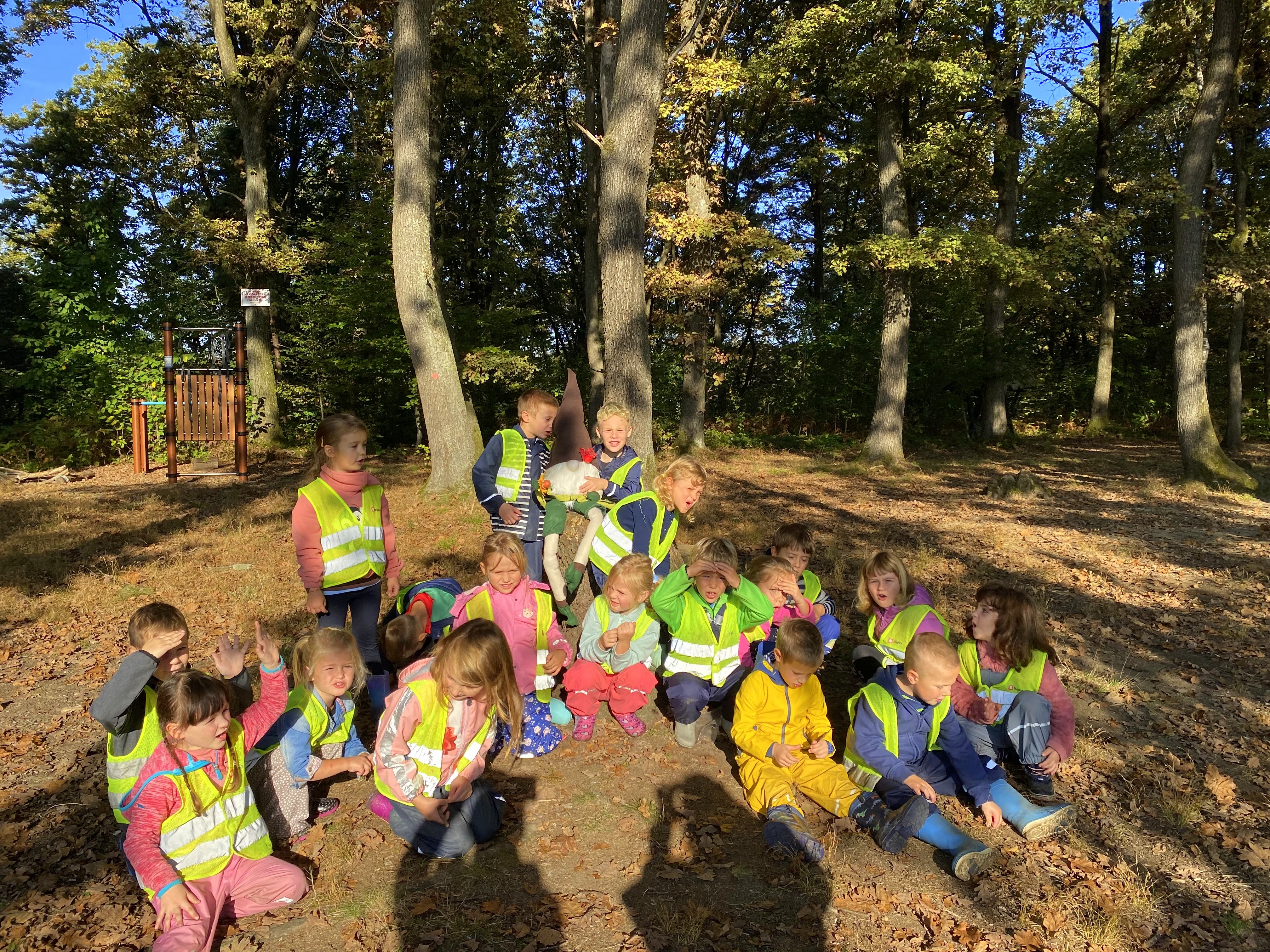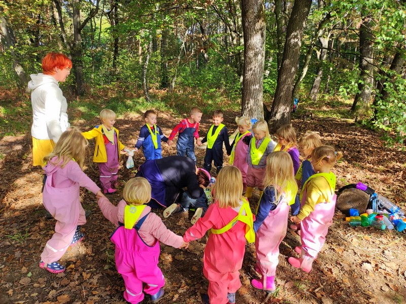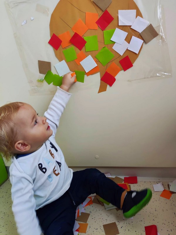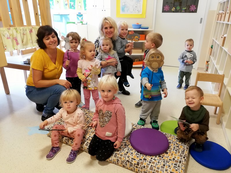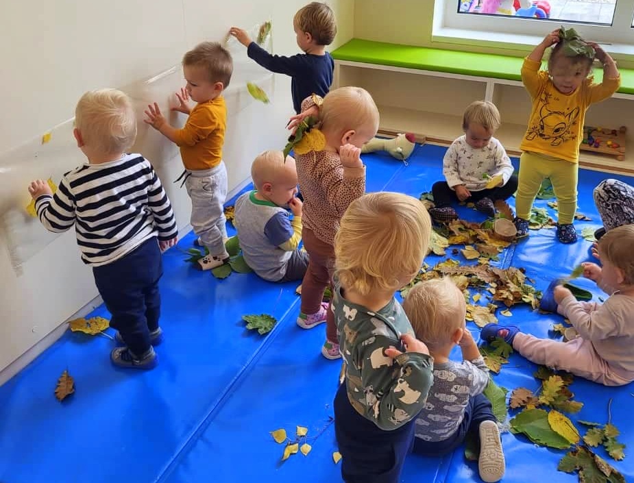 Ringarajčkom je maskota skupine, po imenu Kiki s pomočjo čarobne vreče, v igralnici pričarala jesen. Zelena igralnica je postala polna jesenskih čudovitih odtenkov. Z listi so se igrali, jih lepili na folijo, trgali in skupaj pospravljali nered. Igrali so se s palicami, vozili, magneti, ustvarjali s prstnimi barvami, a veliko časa preživeli prav zunaj. Iz čarobne skrinjice pa je prikukal ježek, po imenu Bežek, ki jih je naučil prvo kitico pesmi - Živali jeseni (M. Voglar). Odpravili so se tudi v gozd, kjer so raziskovali in uživali v zvokih narave.