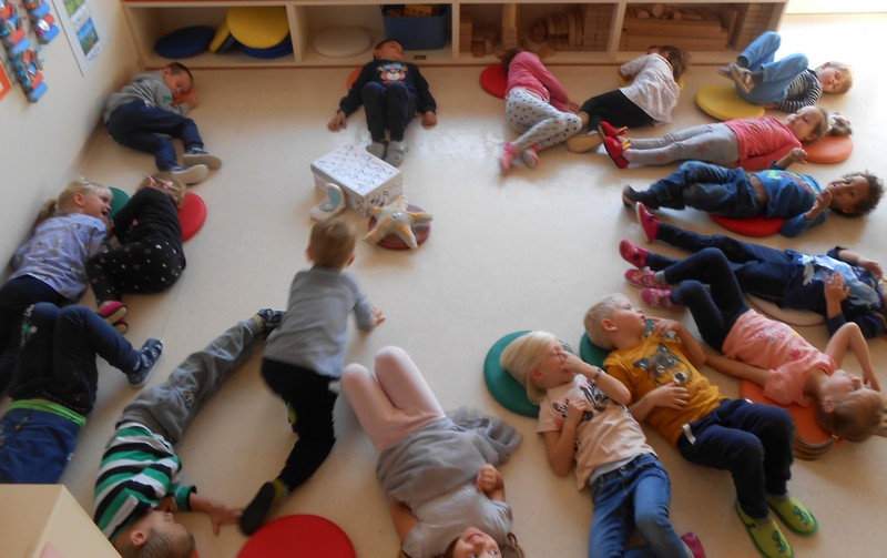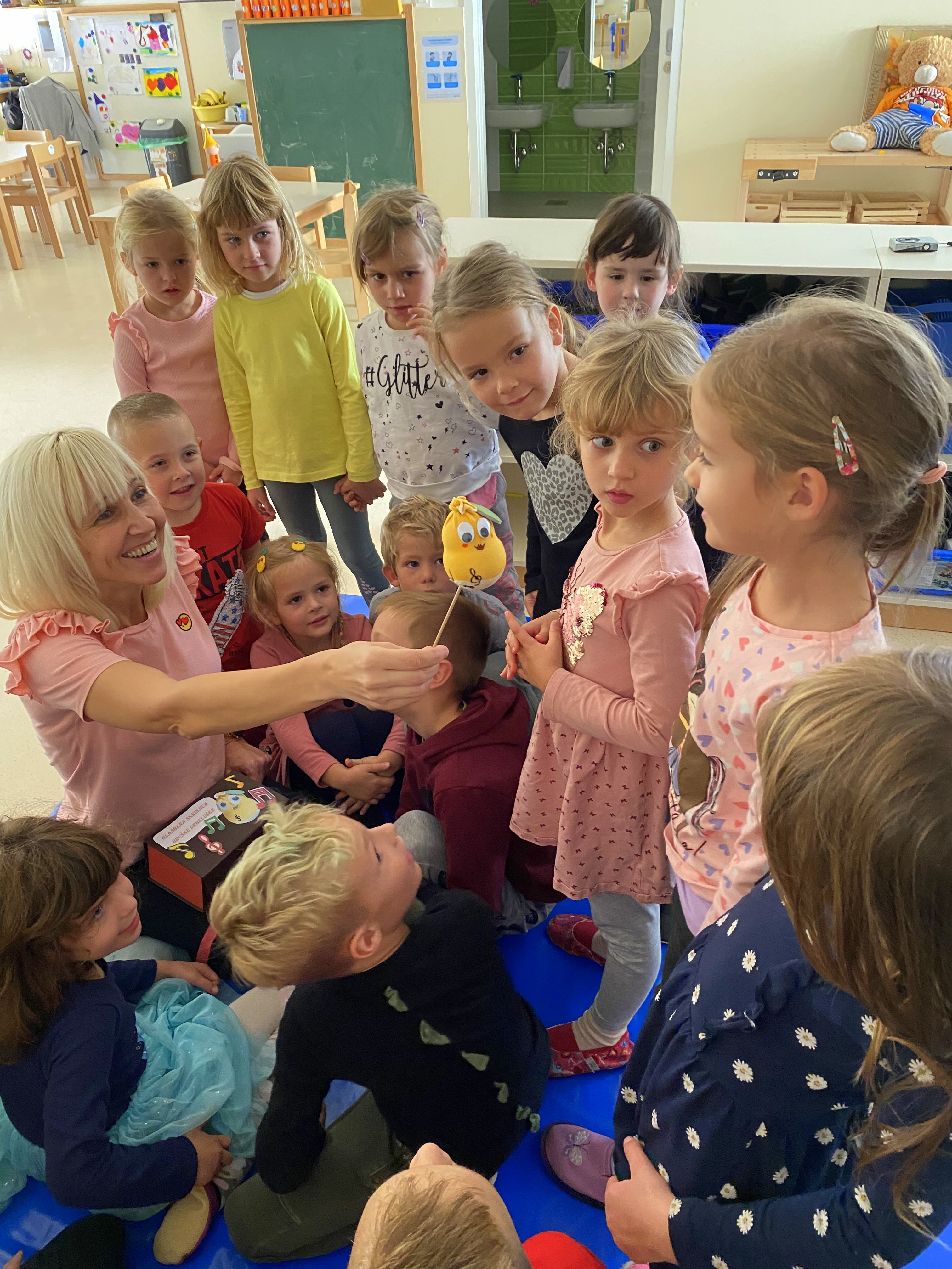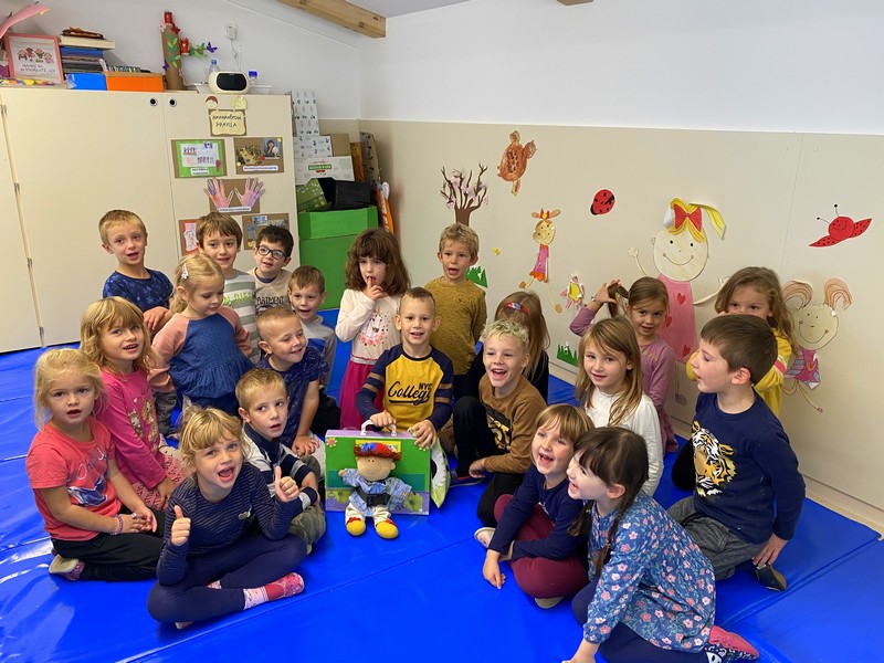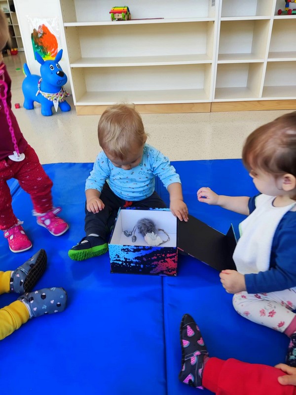 Najstarejši Navihančki pa so ob tednu otroka veliko časa namenili socialnim igram za povezanost v skupini, pogovoru o prijateljstvu, kaj radi počnejo skupaj. Lepo vreme pa jih je vabilo v gozdno igralnico. V skupino je prišla glasbena skrinjica z maskoto Hruško Debeluško, ki je velika zaspanka in so jo prebudili šele s pesmico Rjava pesmica.