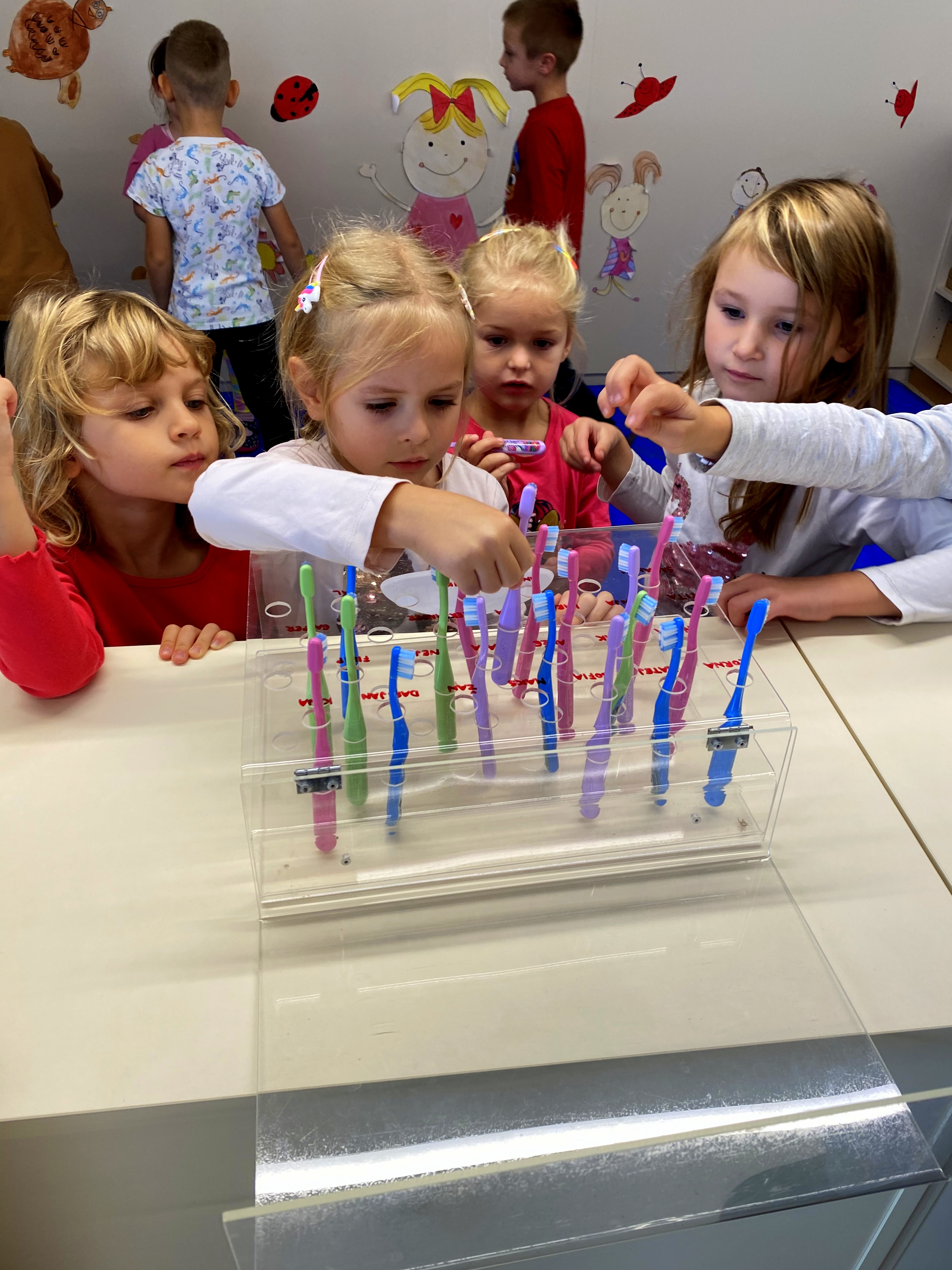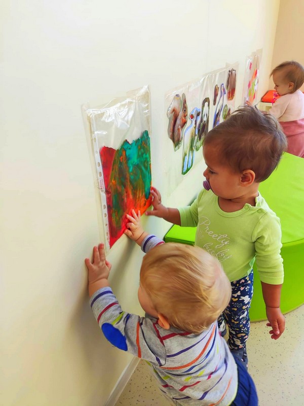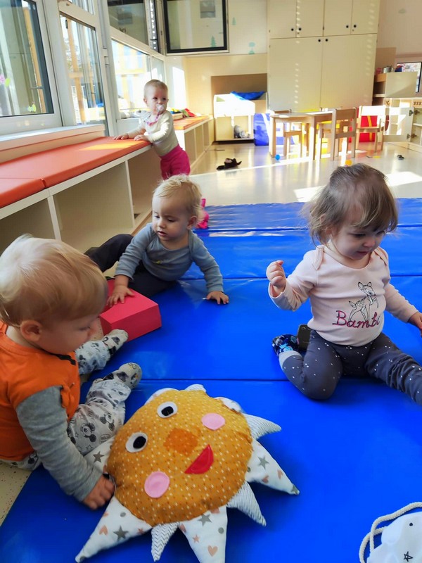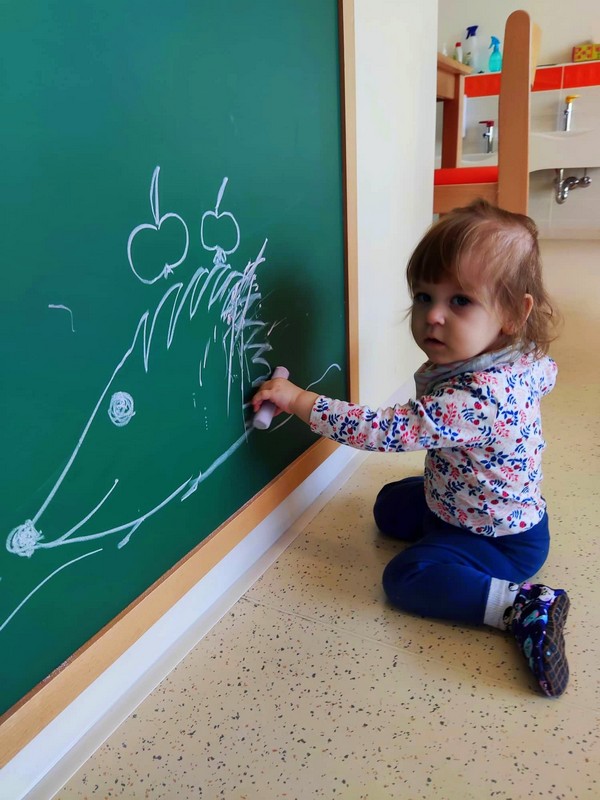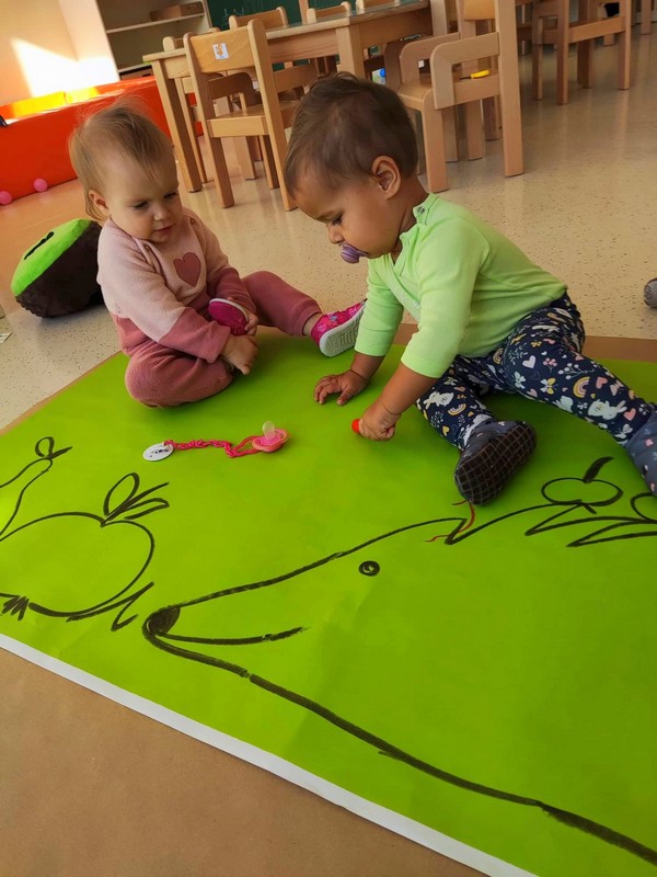 Naši najmlajši Sončki so teden začeli zelo barvito, kot je barvita jesen. Risali so s poster barvami na motiv ježa, se igrali z jesenskimi barvami in jih mešali med seboj, veliko preživeli na terasi ob božanju sončnih žarkov, se igrali in skupaj kuhali, žogali ter sprejeli medse novinko. Na obisk je prišla glasbena vila, ki jim bo skozi leto popestrila glasbene minutke, knjižni palček Bralček ter sonček Žarko, ki se bo z njimi veselil dni v vrtcu in z njimi obiskoval njihove domove.