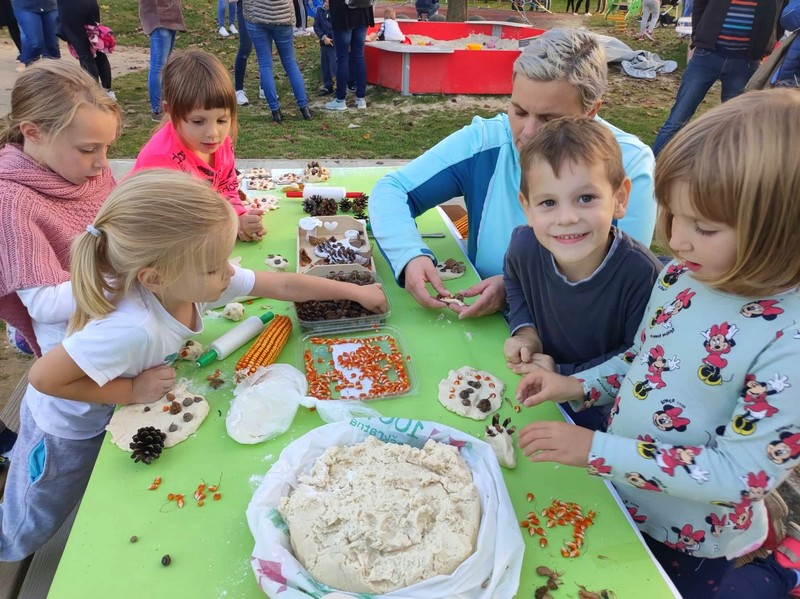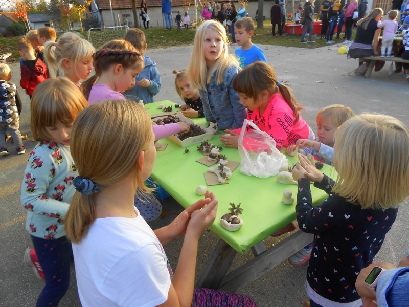 Ker se majhni in veliki radi sladkamo s kostanjem, smo se odločili, da se zberemo na našem vrtčevskem igrišču, zaposlimo naše atije da zakurijo ogenj in spečemo kostanj. In ker nam je botra Jesen z obiskom pustila veliko jesenskih plodov, smo medtem ko se je pekel kostanj, postali umetniki tudi mi. Izdelovali smo gozdne živali iz slanega testa, nastajale so jesenske slike, oblekli ježke z jesenskimi plodovi, se lovili s sestricami in bratci, pokazali mamicam in atijem kako hitri in spretni smo na toboganu, plezalih, se gugali in ob tem neizmerno uživali.