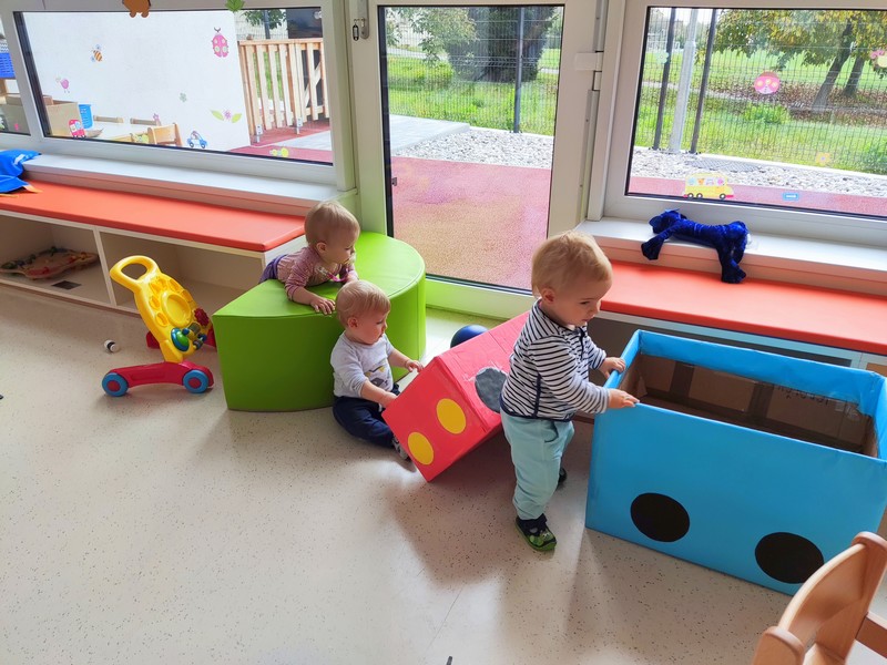 Zelo radi se gibamo. Pa naj bo to igralnica vrtca, terasa ali večnamenski prostori, kjer postavimo poligon, kjer otroci premagujejo ovire, se spotikajo in prevračajo kozolce. Delajo tudi prve samostojne korake, pri tem pa si pomagajo s potiskanjem škatel, stolov, pogajalcev in hodijo ob opori pohištva.