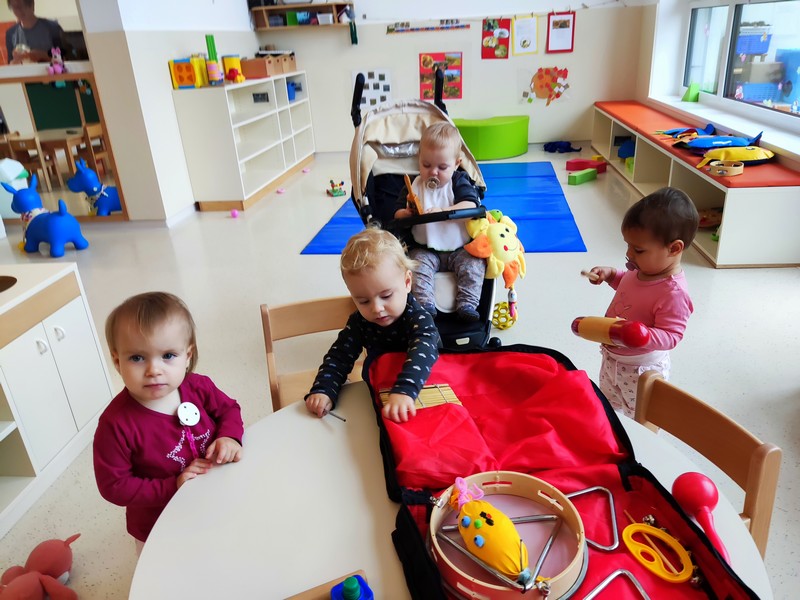 Tudi glasba je naša dnevna spremljevalka. Poslušajo petje vzgojiteljic in igranje na instrumente (ukulele, harmoniko in flavto) ter avdio posnetke in se ob njih gibajo in plešejo. Poslušamo pesmi o jeseni in živalih, igramo na male ritmične instrumente in se igramo prstne igre.