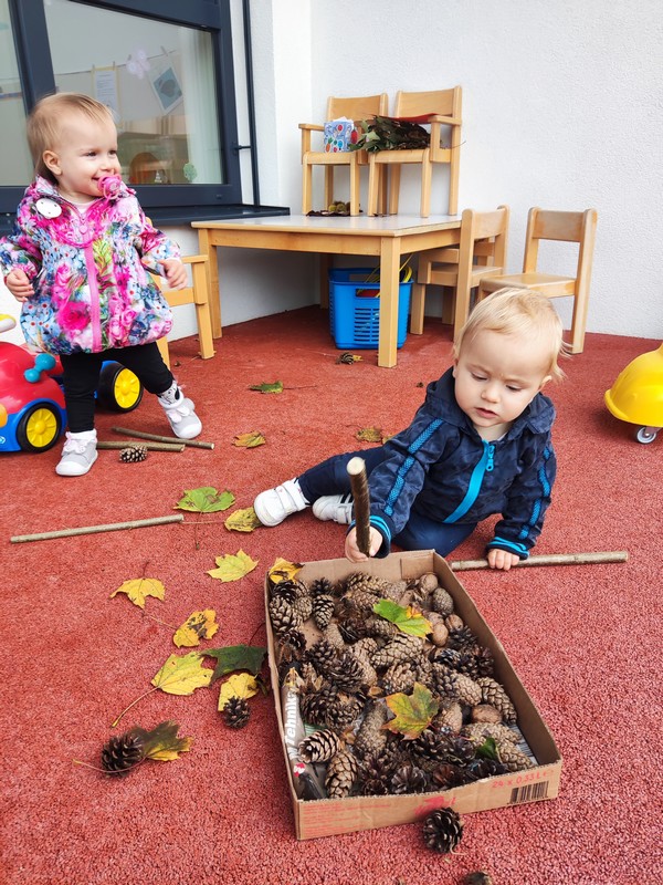Mati narava je to jesen radodarna z najrazličnejšimi plodovi in ker je gozd za nas še predaleč, smo nekaj teh plodov prenesli (kostanj, žir, želod, divji kostanj, suho listje, palice, storži …) na teraso igralnice. Otroci so jih spoznavali, tipali, rokovali z njimi ter tudi okušali.