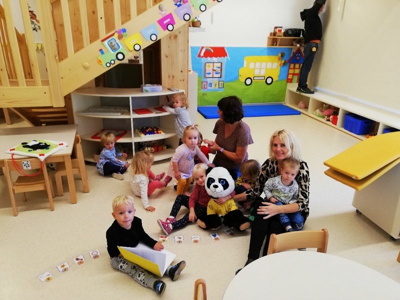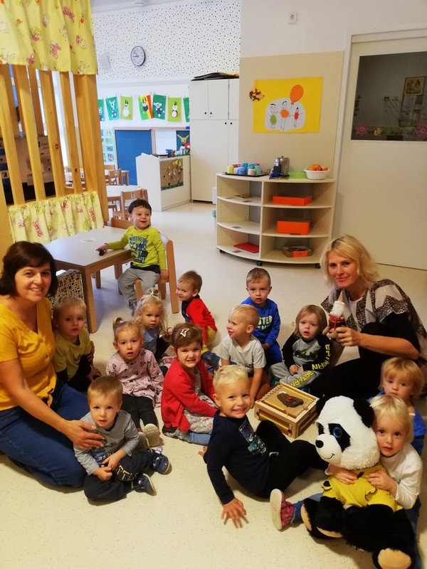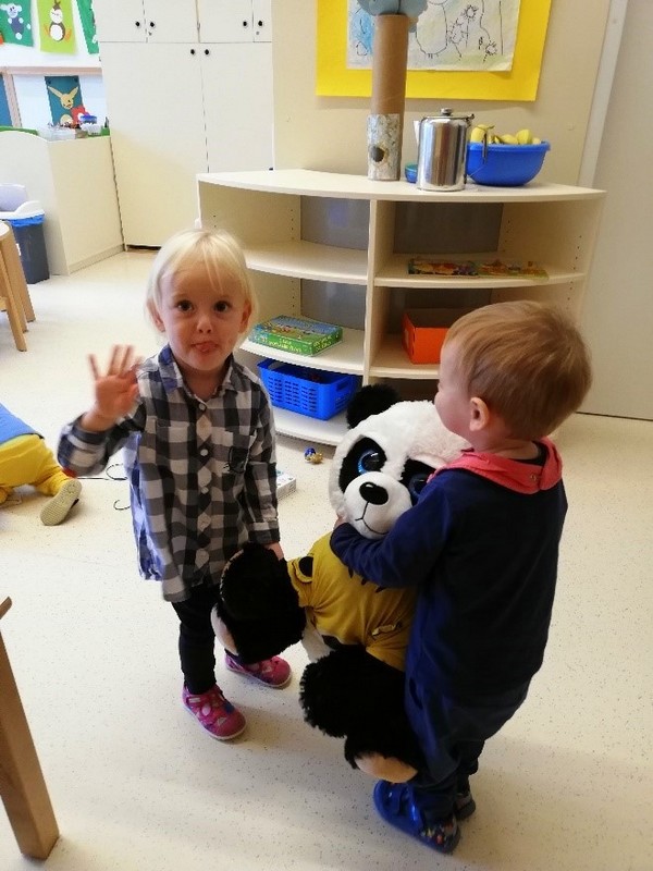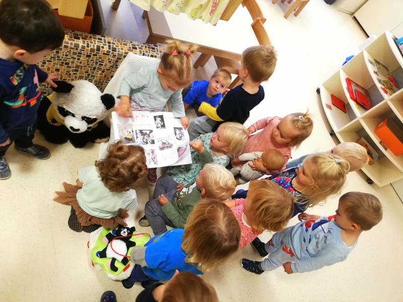 Takole je v tednu otroka v našo skupino prispela nova maskota medvedka panda. In to posebno mehka, z velikimi modrimi očmi. V naše prostore je prinesla zares veliko veselja in radosti. Kajti odkar biva v naši igralnici, jo ne izpustimo iz rok.