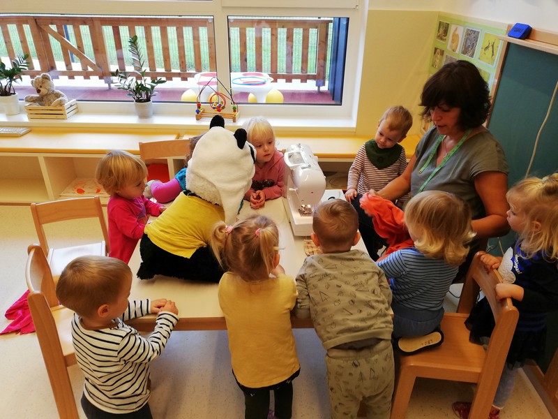 Iz dogajanja pri nas ste opazili, da je zares postala del naše skupine. Nekega dne smo se odločili, da bomo za pando sešili novo prevleko za stol. Takole nestrpno smo prav vsi čakali, kaj bo nastalo izpod Katjinih rok…