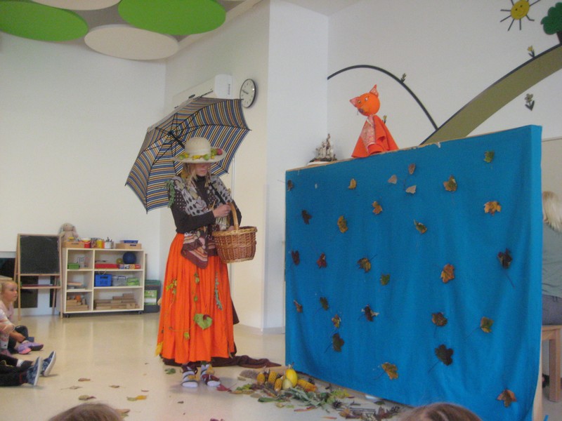 Obiskala nas je tudi v vrtcu in nam pričarala pravljični Jesenski direndaj. S seboj je prinesla ozimnico za gozdne živali, mi pa smo radovedno pokukali v njeno košaro in ji pomagali pri štetju orehov, listkov in slastnih jurčkov. Skupaj smo zapeli pesmice živalim, ki so prišle po dobrote in lisico podučili, da ne smeš nikoli brez vprašanja vzeti, kar ni tvoje.