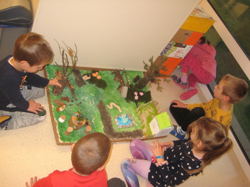 Gozd je naše zavetje, kjer se dobro počutimo in najraje igramo. Zato smo se udeležili natečaja Vseslovenski dan habitata 2022, in sicer z izdelavo makete Naša gozdna igralnica. Izdelali smo jo iz materiala, ki smo ga nabrali (mah, lubje, listi, vejice, želodi, storži …,le gobice smo izdelali iz plastelina, ki ga tudi zelo radi oblikujemo). Na povabilo učiteljice Jasmine smo si z veseljem ogledali razstavo gob, ki jo je z učenci pripravila na šolskem hodniku.