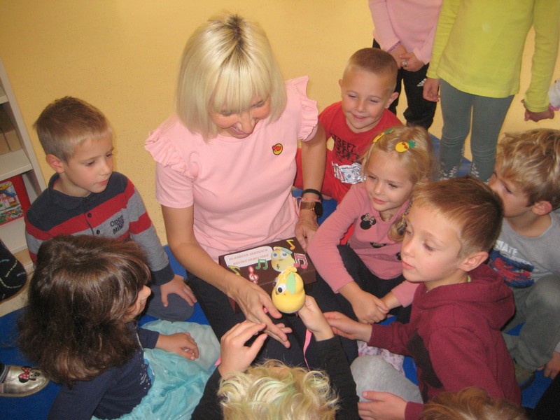 V skupini smo se razveselili glasbene skrinjice, v kateri je nekdo sladko spal … še dobro, da jo je Aleksander že poznal od lanskega leta, tako da nam je hitro prišepnil, da se navihanka prebudi le, če ji zapojemo pesmico ali dve. In res, še preden smo odpeli do konca, je radovedno odprla oči in se razveselila novih obrazov. Ko so ji otroci povedali svoja imena, je glasno vzkliknila: »Jaz pa sem Hruška Debeluška! Rada pojem, plešem in se vrtim, z Navihančki v svet glasbe vsak ponedeljek odhitim!«