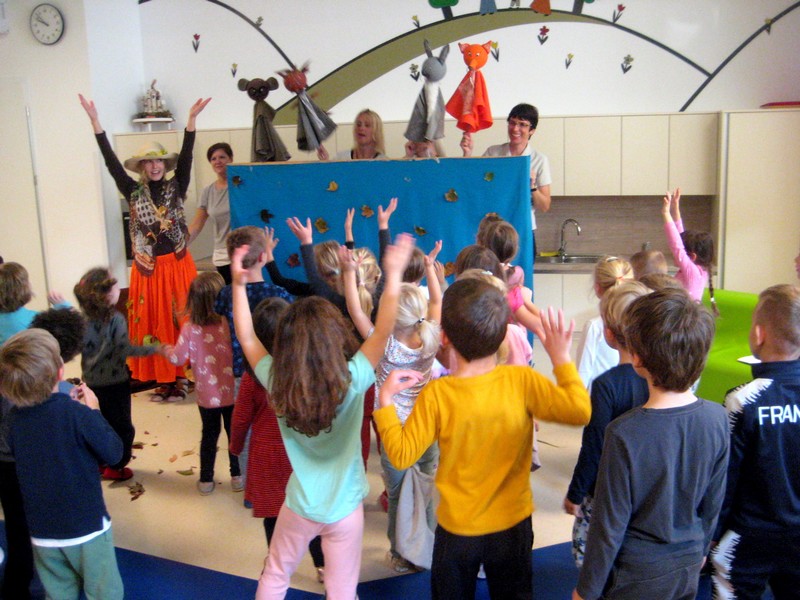 Obiskala nas je tudi v vrtcu in nam pričarala pravljični Jesenski direndaj. S seboj je prinesla ozimnico za gozdne živali, mi pa smo radovedno pokukali v njeno košaro in ji pomagali pri štetju orehov, listkov in slastnih jurčkov. Skupaj smo zapeli pesmice živalim, ki so prišle po dobrote in lisico podučili, da ne smeš nikoli brez vprašanja vzeti, kar ni tvoje.