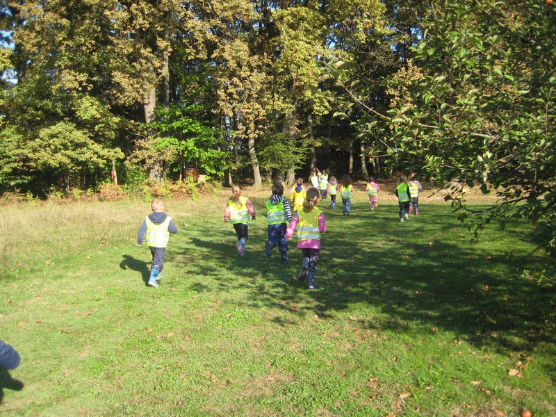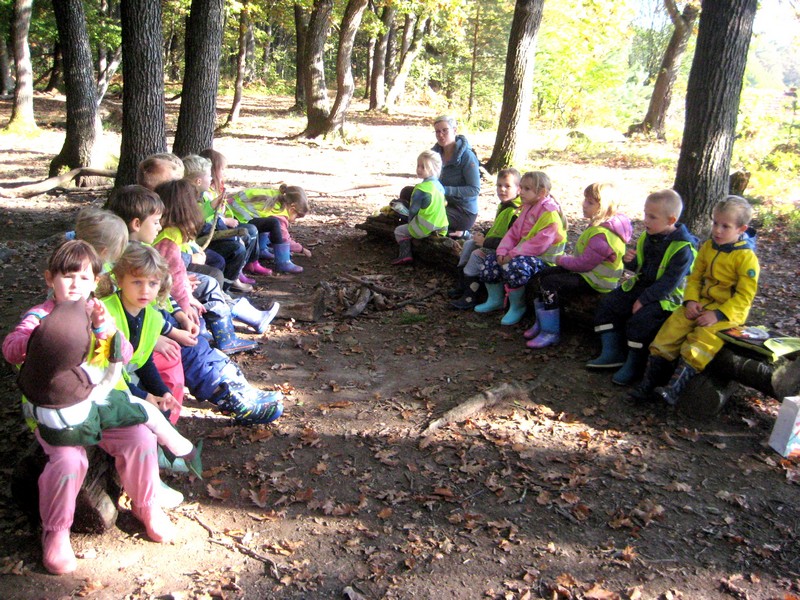 V gozdu se poleg igre tudi spontano učimo … utrjujemo barve, štejemo, primerjamo, merimo dolžine palic ... skuhamo kakšno gozdno enolončnico za škratke in jim naredimo jesenske pogrinjke ter urimo svoje gibalne sposobnosti.