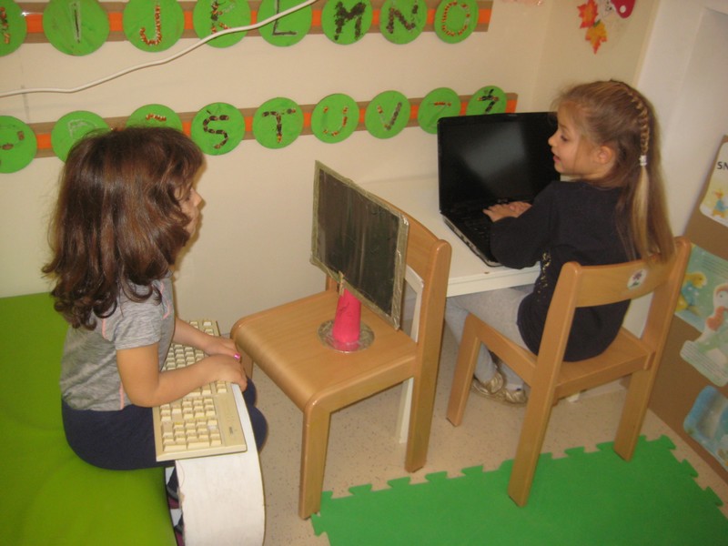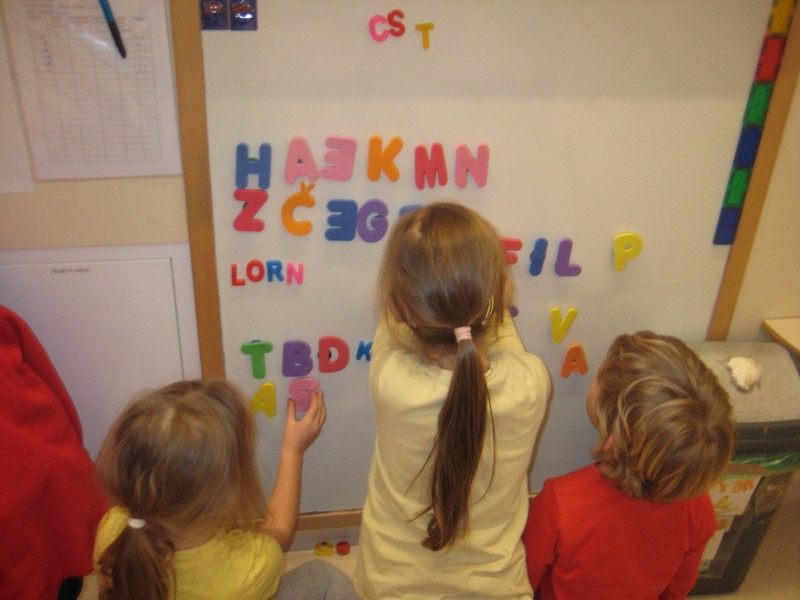 Zanimajo nas tudi črke, ki jih preslikujemo, sestavljamo imena, ugotavljamo začetne glasove, iščemo besede (dolge/sladke/kisle/smešne/gozdne,…), se pogovarjamo o imenih družinskih članov. Ob sredah z veseljem prisluhnemo našemu Ringarajčku Bralčku, ki nas vsakič navduši z novo, zanimivo zgodbo. V pogovoru in opisovanju dogodkov se trudimo uporabljati cele stavke, govoriti glasno in razločno.