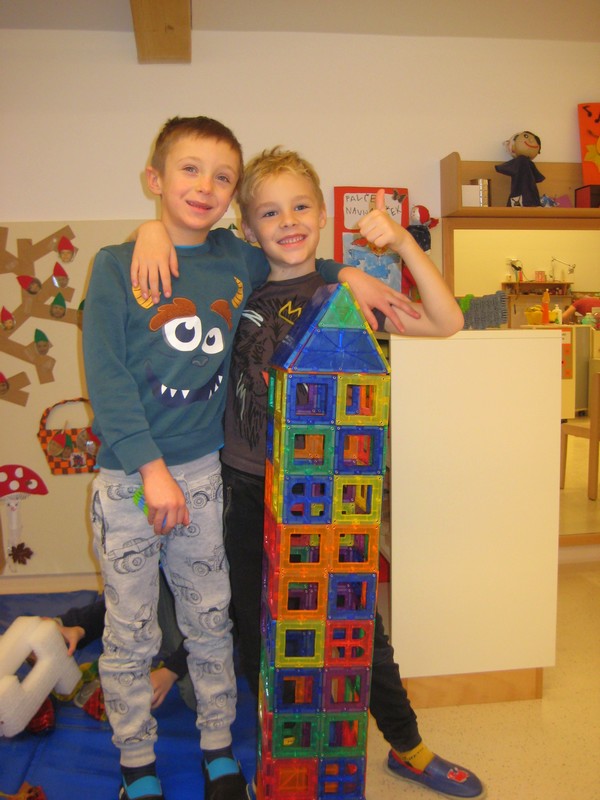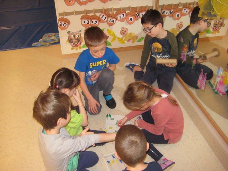 Naši koraki, ki so bili včasih majhni, negotovi, so zdaj postali veliki, odločni in pogumni. Vsak dan nas do igralnice vodijo stopnice, ki jih premagujemo, preskakujemo…označili smo jih s številkami, ki nas spodbujajo k štetju in matematiki. Ta nas spremlja na vsakem koraku. Barvi škratkov na naših mizah, označevanju koledarja, štetju otrok, družabnih igrah, sestavljanju stolpcev, oblikah drevesnih krošenj v gozdu, socialnih igrah, štetju avtomobilov na sprehodu.