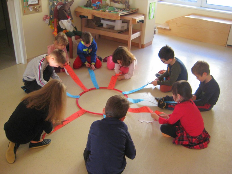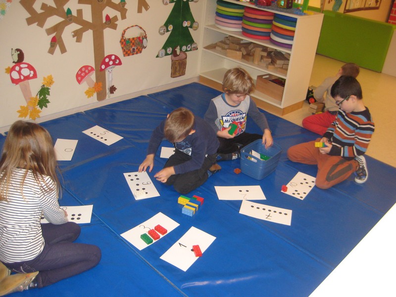 Naši koraki, ki so bili včasih majhni, negotovi, so zdaj postali veliki, odločni in pogumni. Vsak dan nas do igralnice vodijo stopnice, ki jih premagujemo, preskakujemo…označili smo jih s številkami, ki nas spodbujajo k štetju in matematiki. Ta nas spremlja na vsakem koraku. Barvi škratkov na naših mizah, označevanju koledarja, štetju otrok, družabnih igrah, sestavljanju stolpcev, oblikah drevesnih krošenj v gozdu, socialnih igrah, štetju avtomobilov na sprehodu.