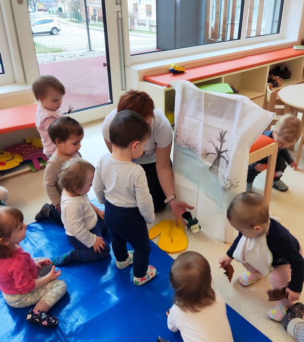 Da smo dejavnost popestrili, smo za otroke pripravili lutkovno predstavo. Pred začetkom predstave smo pripravili prostor, prizorišče in prstne lutke. Otroci so posedli na blazino, ker pa je bilo dogajanje zelo vabljivo, so le s težavo obsedeli, poslušali in samo opazovali. Vedoželjno so hodili naokrog in čakali, kdaj bodo lahko od blizu pogledali lutke in z njimi rokovali. Ko so dobili priložnost, so lutke natikali na prste, jih ogledovali in z njimi manipulirali.