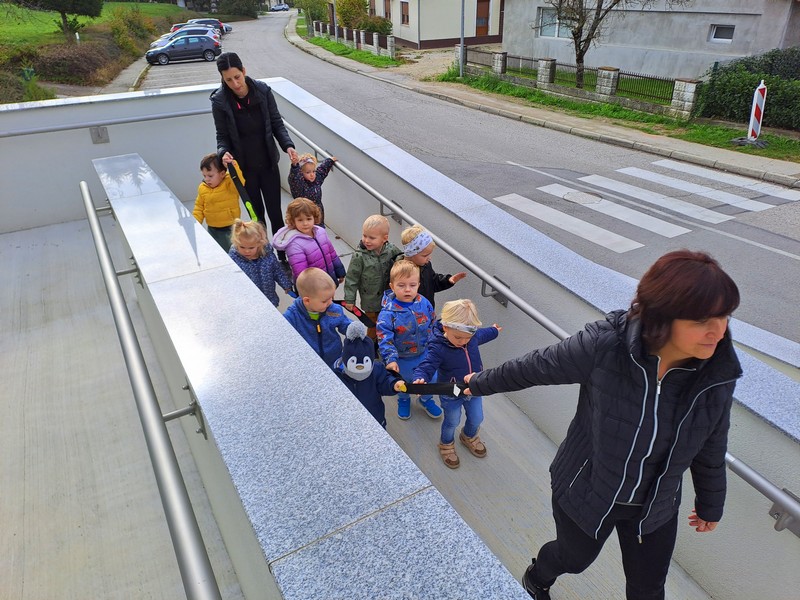 Ti zimski dnevi, obsijani s soncem so čudoviti in kot naročeni za sprehode. Zato se večkrat odpravimo na sprehod po bližnji okolici vrtca. Pri tem nam je v pomoč sprehajalna vrvica, katero smo poimenovali Biba. Med sprehodom opazimo veliko zanimivih reči. Obvezno moramo pozdraviti kužka, ki živi blizu vrtca. Opazujemo muce, kokoši, ki se pasejo po dvorišču in iščejo črvičke in pa seveda ptičke na krošnji dreves. Radi poslušamo njihovo oglašanje. V zimskem času največkrat slišimo vrabčke, srake in vrane.