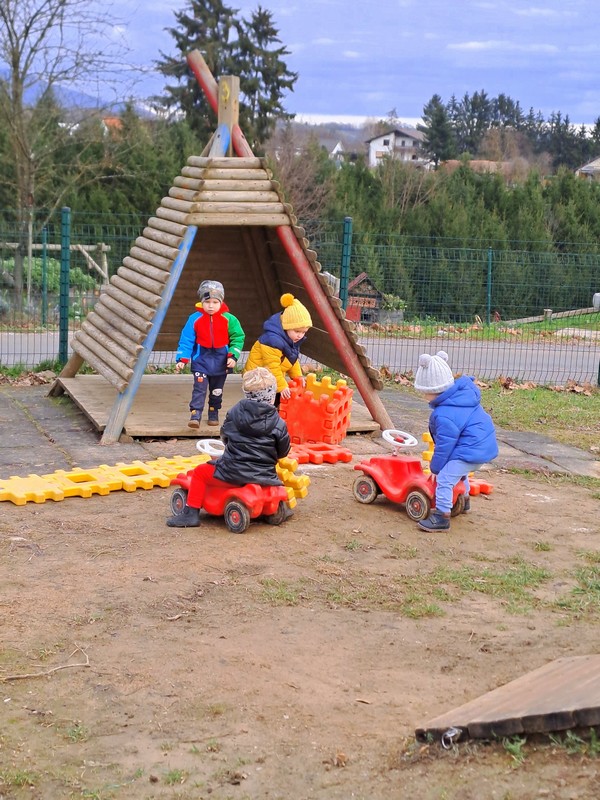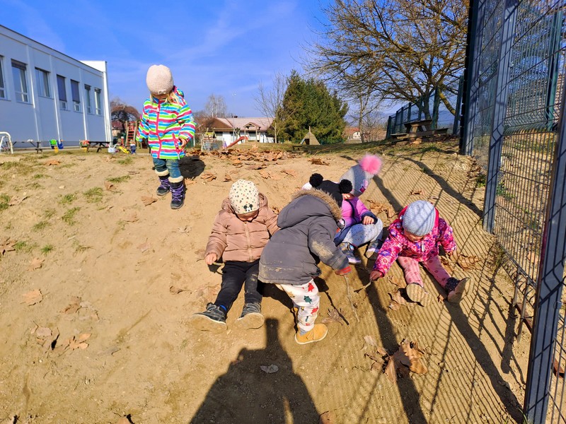 V našem vrtcu se trudimo vzgajati odporne in zdrave otroke ob vsakodnevnem bivanju na prostem. Spodbujamo jih h gibanju v vseh letnih časih in vremenskih razmerah.
