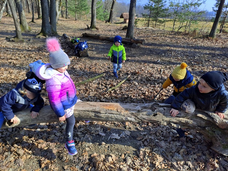 Naš vrtec se nahaja na podeželju, v neposredni bližini gozda, zato se pogosto in z veseljem odpravimo do njega. Ob prihodu ga najprej prijazno pozdravimo in vstopimo skozi gozdna vrata. Že ob vstopu nas očara z vso svojo lepoto in raznolikostjo, ki nam jo gozd ponuja. Veliko drevesno deblo ki je na tleh, je odlično za plezanje guganje, raziskovanje, saj je na njem polno luknjic. Le kaj se skriva v njih in kdo je to naredil? Vejice, ki jih je polno na tleh različnih oblik in velikosti, so zelo uporabne za igro. Otroci jih prenašajo in gradijo hišice, z njimi premikajo listje, rišejo po zemlji in še mnogo drugih reči. Spet drugi pa se spuščajo po manjšem hribčku in urijo svoje gibalne sposobnosti in si pri tem prijazno pomagajo. Fantje zelo radi pokažejo kako močni so in kako velike mišice imajo. Nekateri pa se dreves preprosto dotikajo, božajo, vonjajo, okušajo ali pa samo opazujejo.