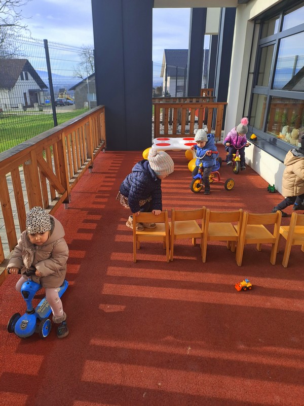 Vsaka igralnica v našem vrtcu ima tudi izhod na teraso, ki nudi prostor za različne dejavnosti. Zelo nam je všeč, kadar si naredimo poligon iz stolov in po njih hodimo. Pri tem deklica nadzira, da bo potekalo vse po pravilih. Ostali pa preizkušajo svoje »šoferske« sposobnosti.