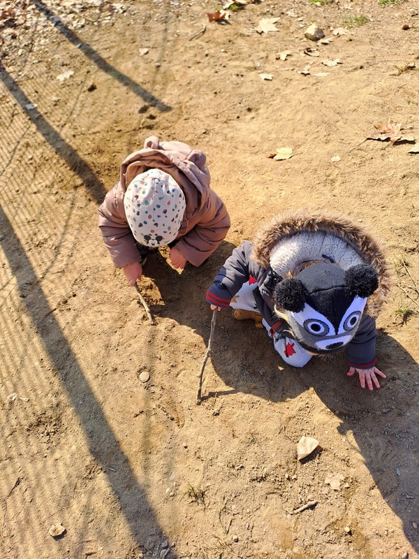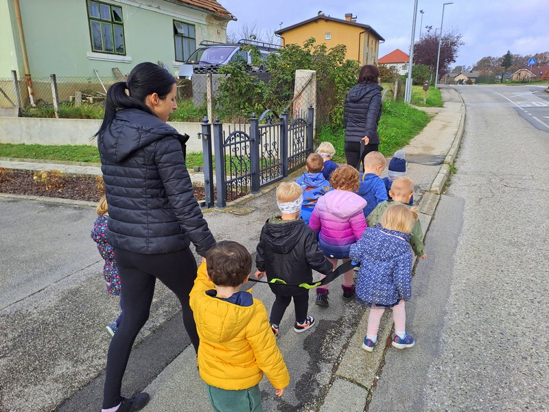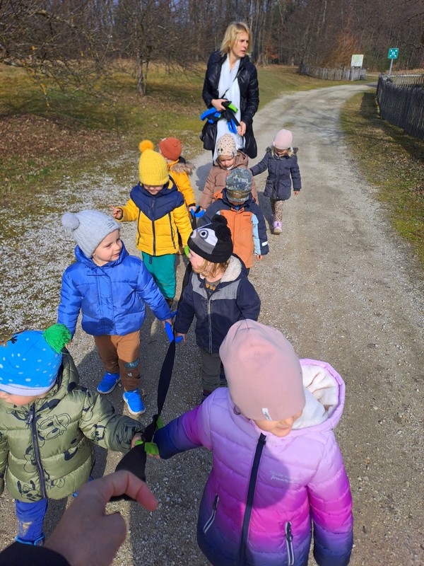 Ti zimski dnevi, obsijani s soncem so čudoviti in kot naročeni za sprehode. Zato se večkrat odpravimo na sprehod po bližnji okolici vrtca. Pri tem nam je v pomoč sprehajalna vrvica, katero smo poimenovali Biba. Med sprehodom opazimo veliko zanimivih reči. Obvezno moramo pozdraviti kužka, ki živi blizu vrtca. Opazujemo muce, kokoši, ki se pasejo po dvorišču in iščejo črvičke in pa seveda ptičke na krošnji dreves. Radi poslušamo njihovo oglašanje. V zimskem času največkrat slišimo vrabčke, srake in vrane.