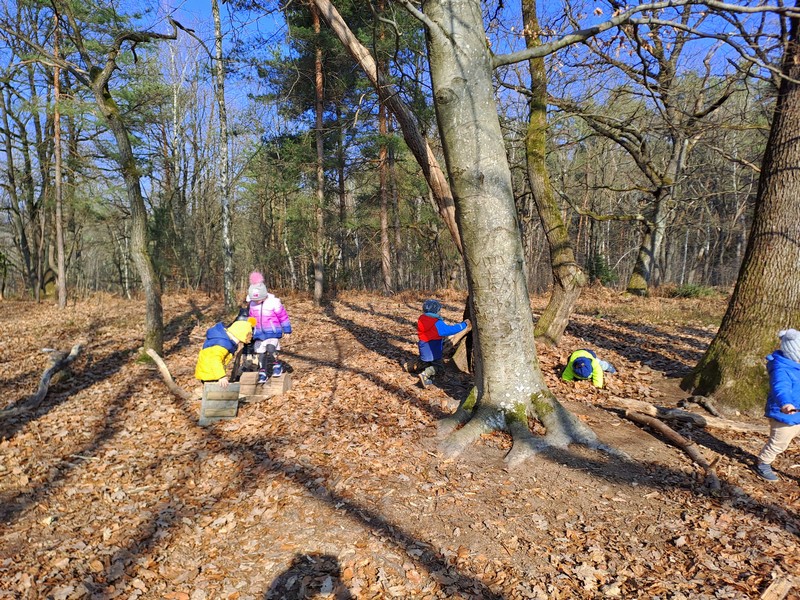 Torej gozd nam ponuja veliko različnega materiala za ustvarjanje in igro. Prostor jim že sam po sebi nudi spodbudno učno okolje, kjer razvijajo svojo domišljijo.