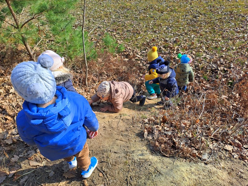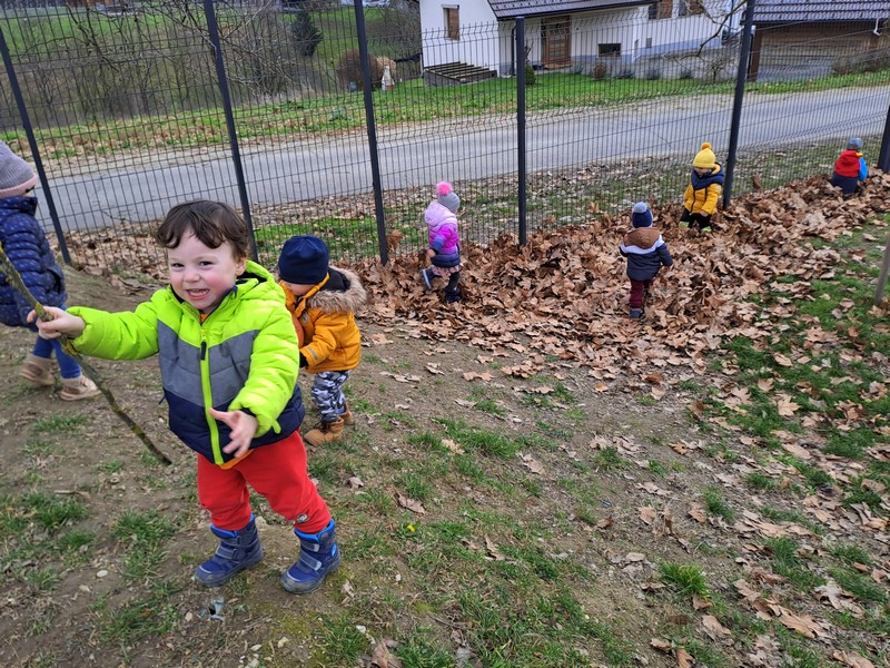 Naš vrtec se nahaja na podeželju, v neposredni bližini gozda, zato se pogosto in z veseljem odpravimo do njega. Ob prihodu ga najprej prijazno pozdravimo in vstopimo skozi gozdna vrata. Že ob vstopu nas očara z vso svojo lepoto in raznolikostjo, ki nam jo gozd ponuja. Veliko drevesno deblo ki je na tleh, je odlično za plezanje guganje, raziskovanje, saj je na njem polno luknjic. Le kaj se skriva v njih in kdo je to naredil? Vejice, ki jih je polno na tleh različnih oblik in velikosti, so zelo uporabne za igro. Otroci jih prenašajo in gradijo hišice, z njimi premikajo listje, rišejo po zemlji in še mnogo drugih reči. Spet drugi pa se spuščajo po manjšem hribčku in urijo svoje gibalne sposobnosti in si pri tem prijazno pomagajo. Fantje zelo radi pokažejo kako močni so in kako velike mišice imajo. Nekateri pa se dreves preprosto dotikajo, božajo, vonjajo, okušajo ali pa samo opazujejo.