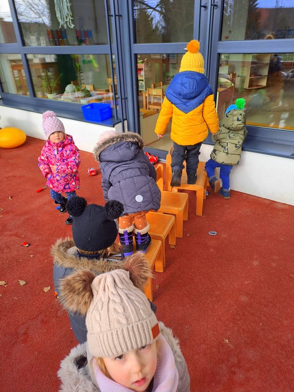 Vsaka igralnica v našem vrtcu ima tudi izhod na teraso, ki nudi prostor za različne dejavnosti. Zelo nam je všeč, kadar si naredimo poligon iz stolov in po njih hodimo. Pri tem deklica nadzira, da bo potekalo vse po pravilih. Ostali pa preizkušajo svoje »šoferske« sposobnosti.