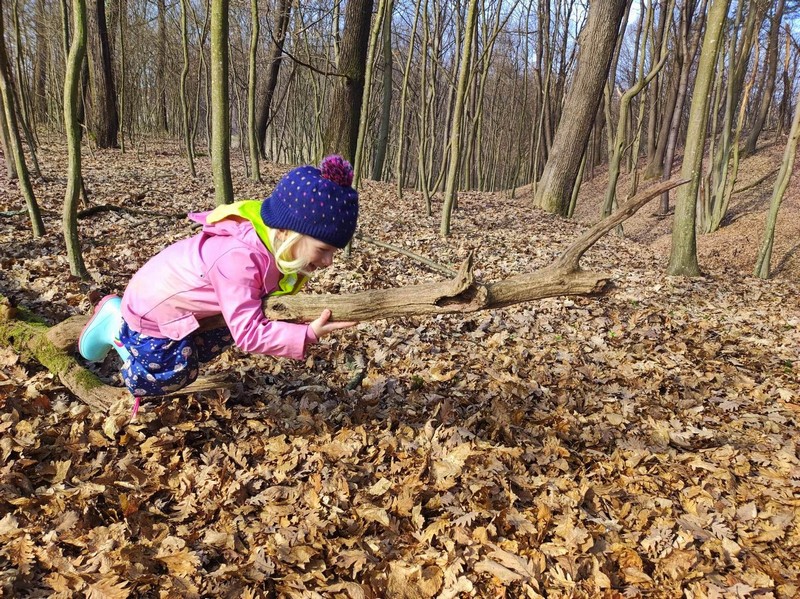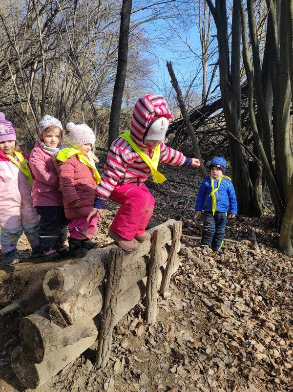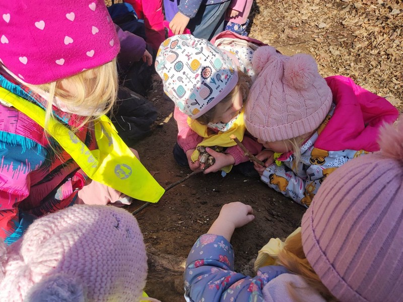 Narava, predvsem gozd, otrokom nudi mnogo različnih senzoričnih izkušenj, ki jih nikjer drugje ne morejo doživeti v taki polnosti. Zemlja je bila trda, a pri potoku, kamor radi hodimo, že razmočena, potok je v tekočem stanju, a smo ga uspeli videti tudi v trdem stanju, ko je nastal led. Tipali smo mah, odkrivali trdoto lubja različnih dreves, hodili po odpadlih listih in po tleh rastočem bršljanu.