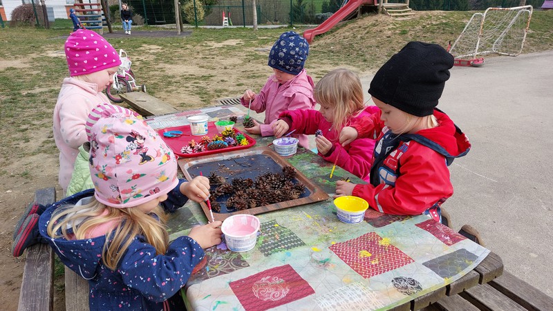 V ta namen smo se odpravili v del Banove hoste, kjer raste veliko smrek in na tleh iskali majhne zaprte storže. Čeprav si je bilo treba vsakega natančno pogledati in pokazati, smo jih kmalu nabrali polno vrečico. V igralnici smo jih očistili iglic in listja, jih položili na 3 pladnje ter iz tedna v teden opazovali, kaj se je z njimi dogajalo. V topli igralnici so se skoraj vsi odprli in če smo jih prijeli v roke, je iz njih nekaj padalo… Skupaj smo ugotovili, da so to semena iz katerih lahko zrastejo nove smreke, v knjigah pa smo odkrivali, katere vse živali se z njimi hranijo. V drugi polovici meseca, so otroci enega za drugim pobarvali, nato pa smo jih pustili na terasi naše igralnice, da so se posušili. Ko je vzg. Sandi vzg. Tanji pomagal narezati brezove veje, so otroci nanje polagali pisane storže in lubje, da jih je vzg. Tanja kasneje z vročim lepilom prilepila. Zadnjo stran so otroci okrasili še z mavrično mislijo in dodali svoje ime…