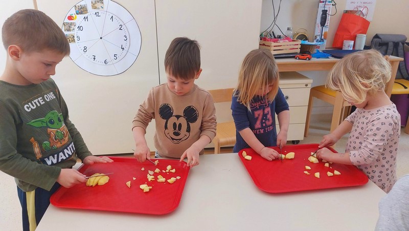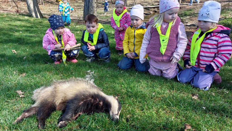 Preostale dni smo prebirali in ustvarjali svojo knjigo o Nemarnih škornjih, si sami narezali sadnje za sadno malico, praznovali 2 rojstna dneva, gradili hiše iz magnetnih, lego in velikih kock, se igrali in razvijali svoje spretnosti na igrišču ter raziskovali gozd… Poleg zvončkov, žafranov, trobentic, podlesnih vetrnic, mačic in pljučnika, smo naleteli tudi na jazbeca. Žal je bil poginjen, a ker nas je zelo zanimal, smo v knjigi »Živali Slovenije« prebirali zanimivosti o njem. Še kviz o njem smo se igrali. Vzg. Patricija nam je v skupnem prostoru pripravila sprostitveno urico, z vzg. Lariso pa smo se začeli pripravljati na našo plesno točko na nastopu v mesecu maju.