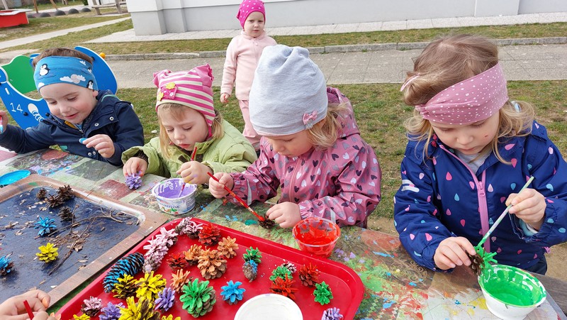 V ta namen smo se odpravili v del Banove hoste, kjer raste veliko smrek in na tleh iskali majhne zaprte storže. Čeprav si je bilo treba vsakega natančno pogledati in pokazati, smo jih kmalu nabrali polno vrečico. V igralnici smo jih očistili iglic in listja, jih položili na 3 pladnje ter iz tedna v teden opazovali, kaj se je z njimi dogajalo. V topli igralnici so se skoraj vsi odprli in če smo jih prijeli v roke, je iz njih nekaj padalo… Skupaj smo ugotovili, da so to semena iz katerih lahko zrastejo nove smreke, v knjigah pa smo odkrivali, katere vse živali se z njimi hranijo. V drugi polovici meseca, so otroci enega za drugim pobarvali, nato pa smo jih pustili na terasi naše igralnice, da so se posušili. Ko je vzg. Sandi vzg. Tanji pomagal narezati brezove veje, so otroci nanje polagali pisane storže in lubje, da jih je vzg. Tanja kasneje z vročim lepilom prilepila. Zadnjo stran so otroci okrasili še z mavrično mislijo in dodali svoje ime…