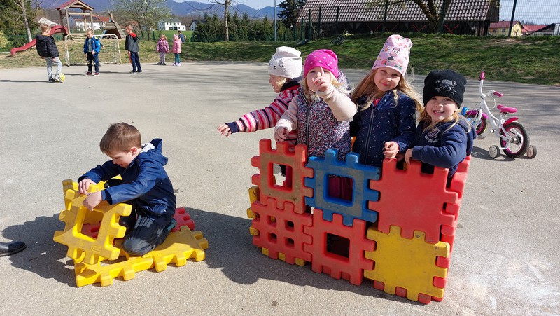 Preostale dni smo prebirali in ustvarjali svojo knjigo o Nemarnih škornjih, si sami narezali sadnje za sadno malico, praznovali 2 rojstna dneva, gradili hiše iz magnetnih, lego in velikih kock, se igrali in razvijali svoje spretnosti na igrišču ter raziskovali gozd… Poleg zvončkov, žafranov, trobentic, podlesnih vetrnic, mačic in pljučnika, smo naleteli tudi na jazbeca. Žal je bil poginjen, a ker nas je zelo zanimal, smo v knjigi »Živali Slovenije« prebirali zanimivosti o njem. Še kviz o njem smo se igrali. Vzg. Patricija nam je v skupnem prostoru pripravila sprostitveno urico, z vzg. Lariso pa smo se začeli pripravljati na našo plesno točko na nastopu v mesecu maju.